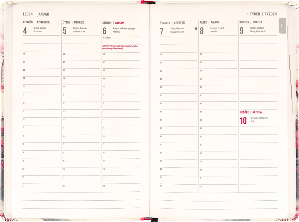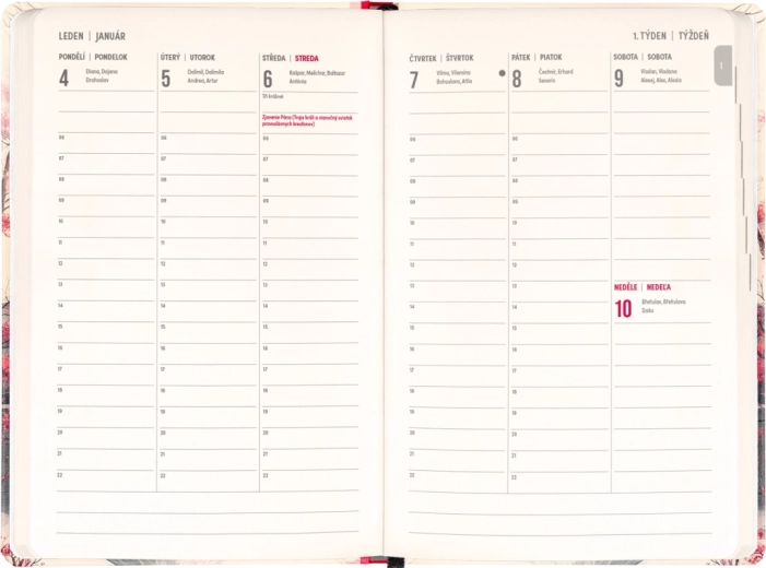 - tygodniowe kolumnowe, czesko‑słowackie z imionami i świętami