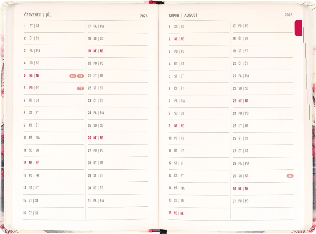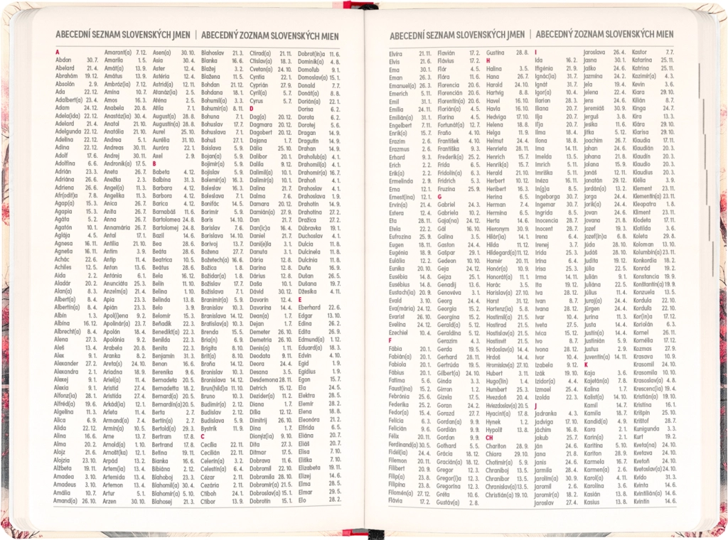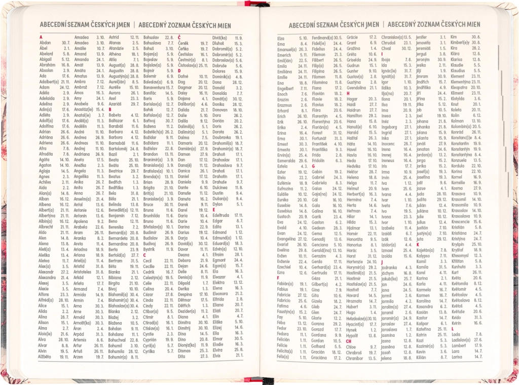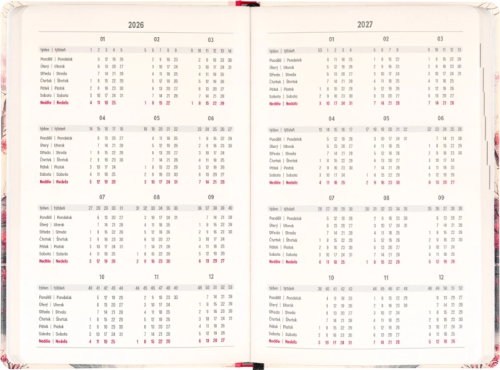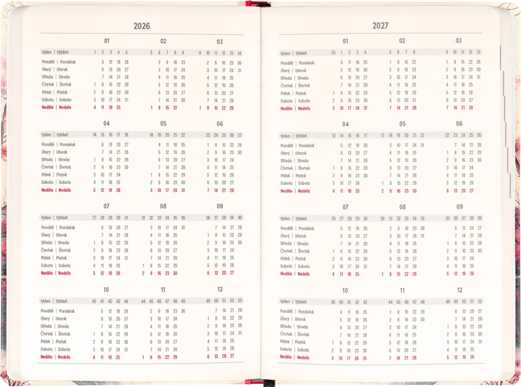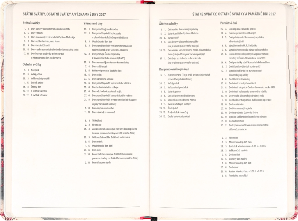 Terminarz uwzględnia codzienne planowanie i wyjątkowe chwile: znajdziesz w nim przegląd roku 2026 i 2027, listę czeskich i słowackich imion oraz przypomnienia o świętach. Przejrzyste kolumny dla poszczególnych dni ułatwiają organizację pracy, szkoły i czasu wolnego.