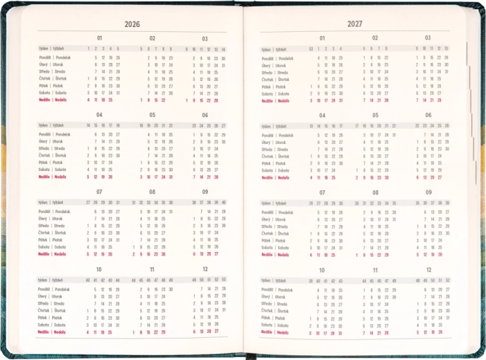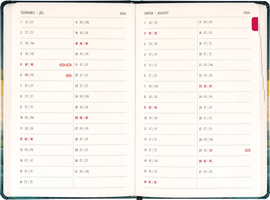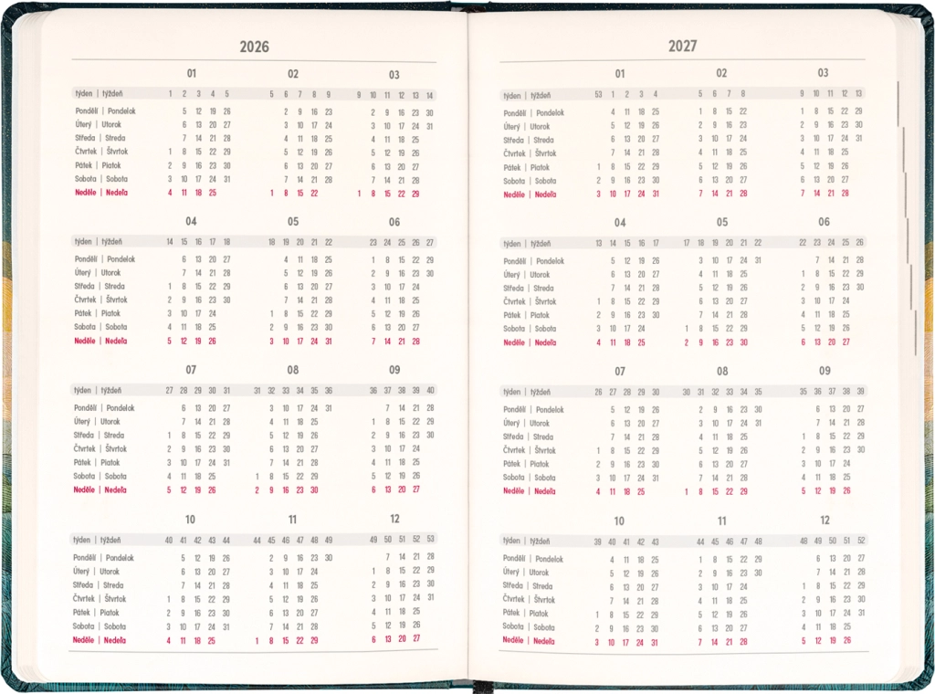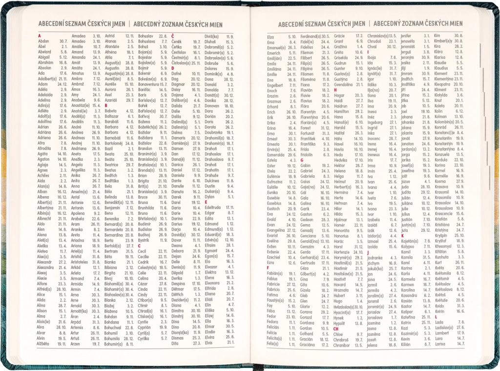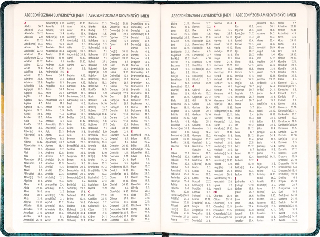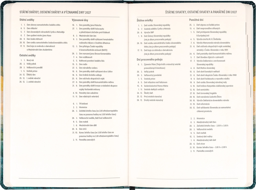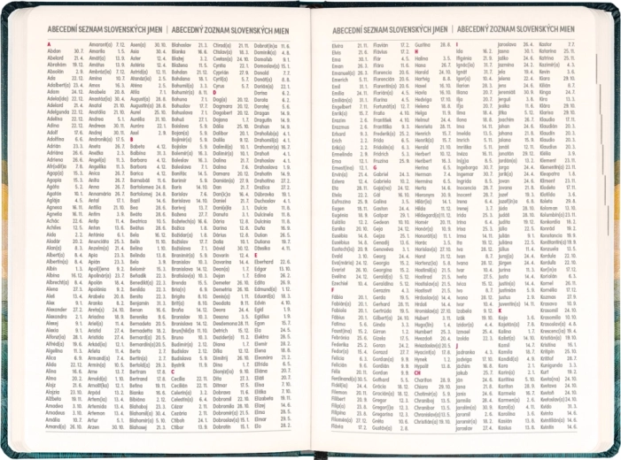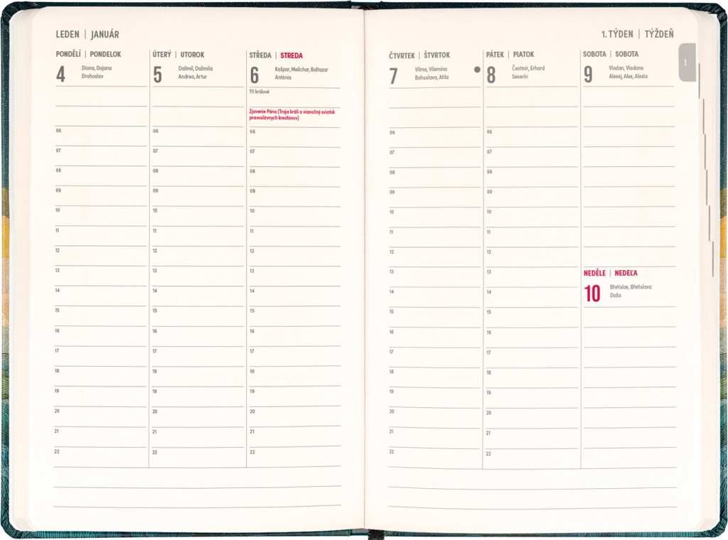 Tygodniowy układ kolumnowy w czesko‑słowackim kalendarium umożliwia szybkie zapisywanie zadań, spotkań i terminów. W zestawie znajduje się także lista czeskich i słowackich imion oraz zaznaczone święta, abyś zawsze miał(a) wszystko pod kontrolą.