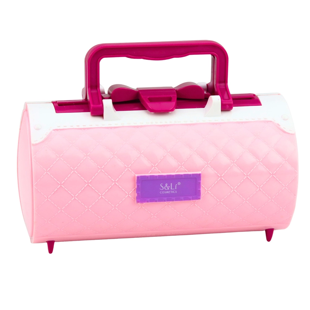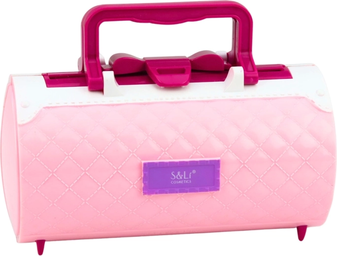 Stylowy różowy kuferek z uchwytem i zamkiem zapewnia wygodne przenoszenie oraz bezpieczne przechowywanie całego zestawu kosmetycznego.