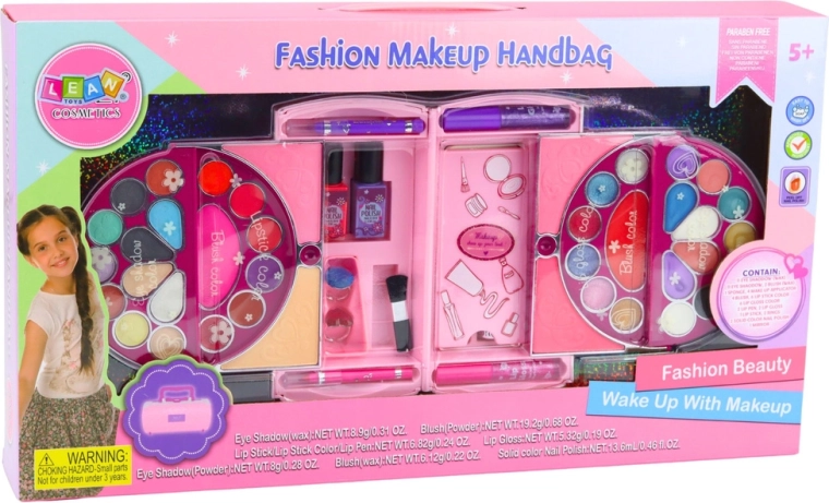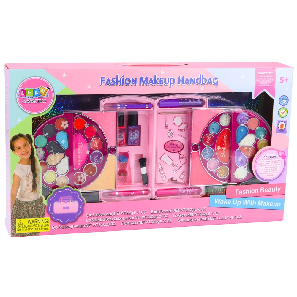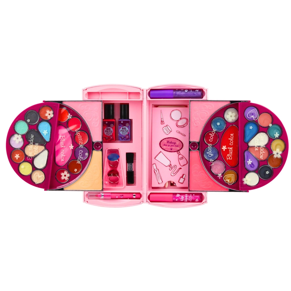 Duży składany różowy kuferek dla małych miłośniczek makijażu oferuje kompletny zestaw dziecięcego make-upu i akcesoriów do paznokci. Po otwarciu zamienia się w przejrzystą paletkę z cieniami do powiek, różami, błyszczykami i lakierami, uzupełnioną o bezpieczne lusterko, aplikatory i gąbeczki. Kosmetyki są delikatne dla dziecięcej skóry, łatwo zmywalne wodą i pachną słodko-owocowo – idealne do kreatywnej zabawy i pierwszych kroków w świecie piękna.