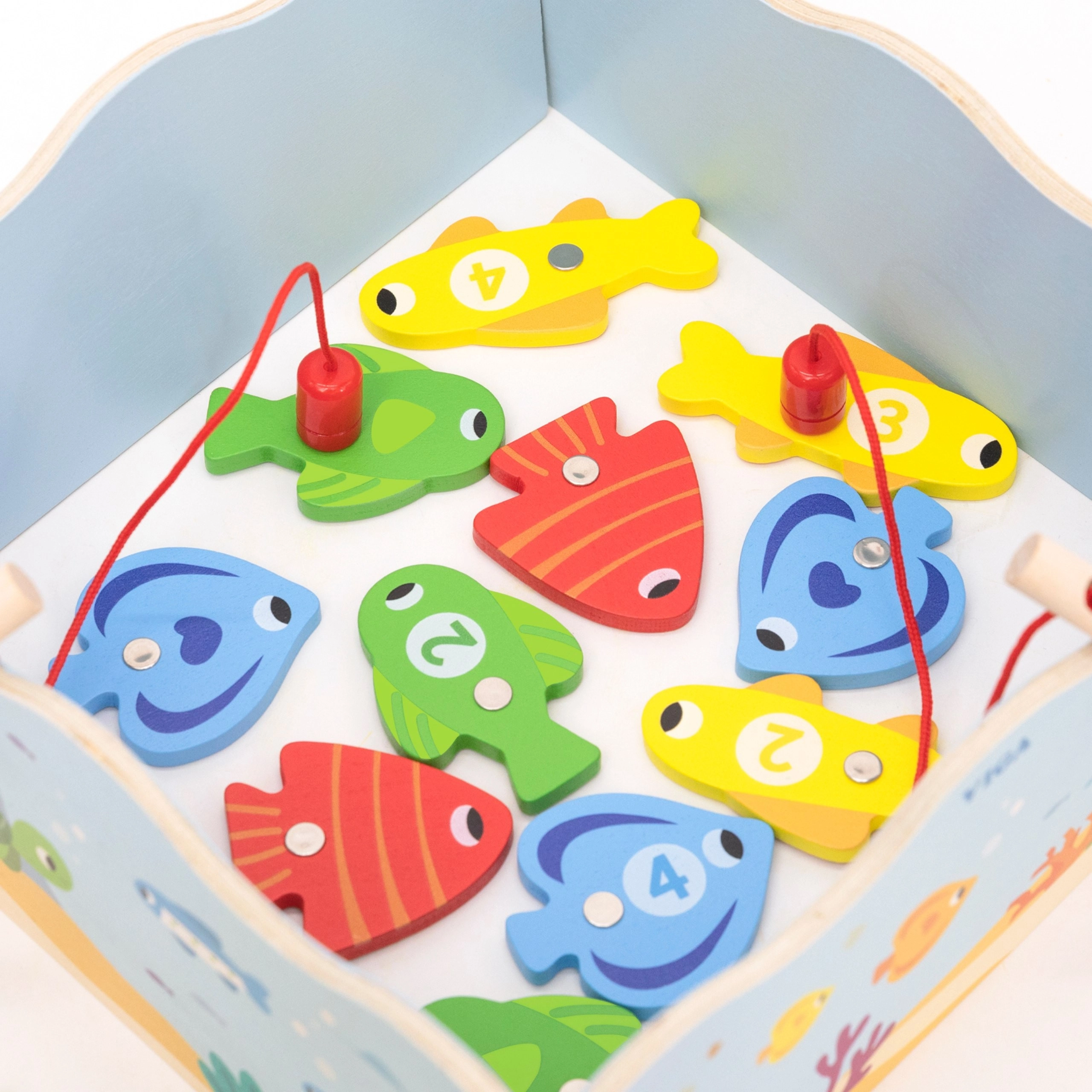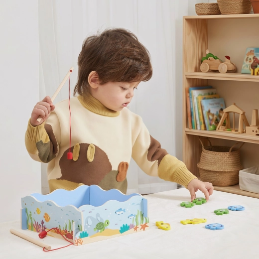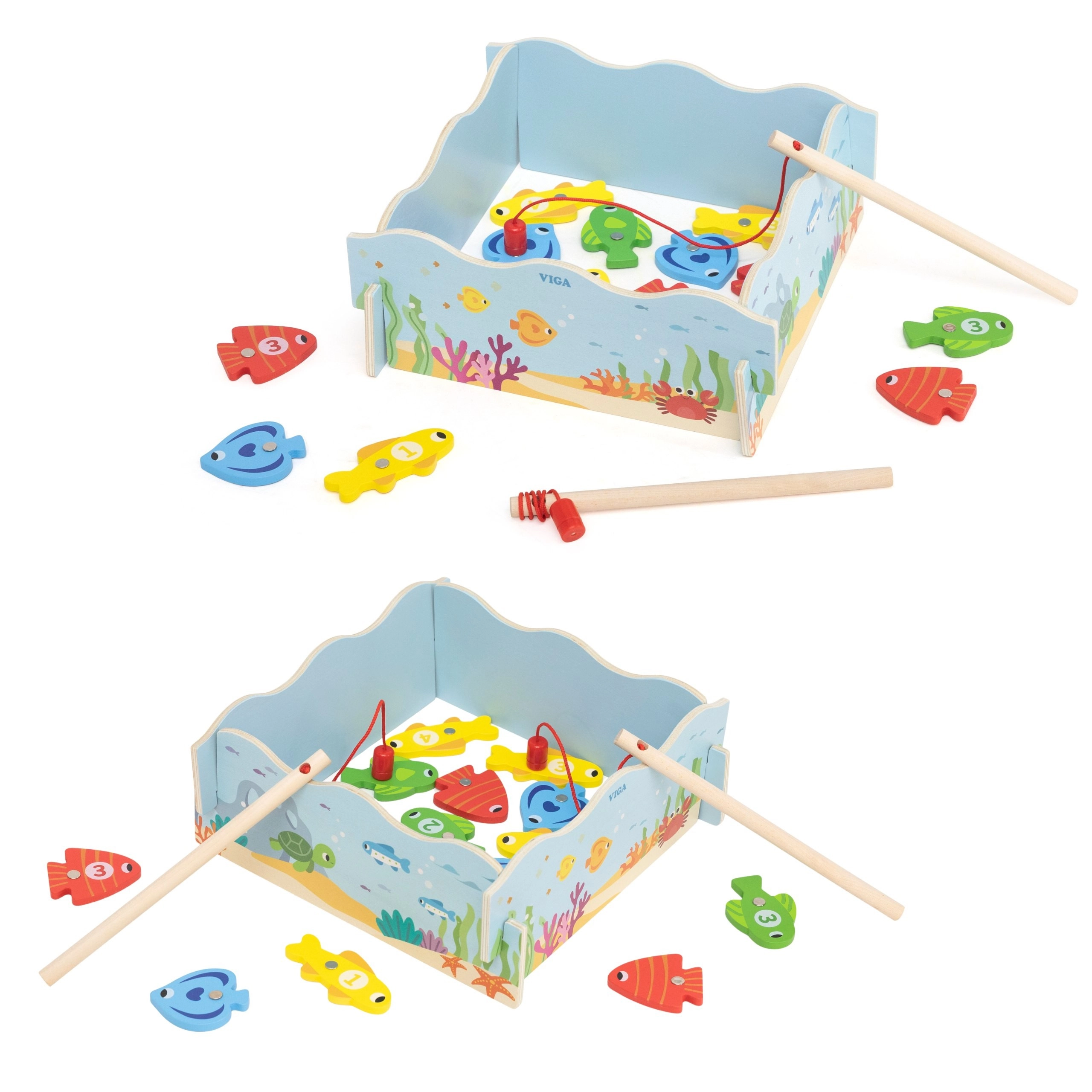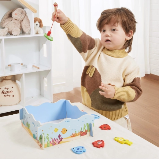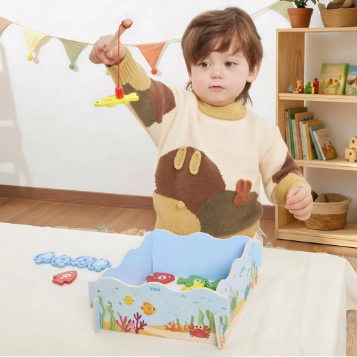 Podaruj dzieciom mądrą zabawę łączącą rozrywkę i naukę. Drewniana magnetyczna gra w łowienie rybek VIGA zawiera kolorowe rybki z cyframi oraz dwie magnetyczne wędki, dzięki którym dzieci ćwiczą precyzję ruchów i koncentrację. Pudełko zamienia się w niebieski „stawik”, a po zabawie wszystko łatwo uporządkować.