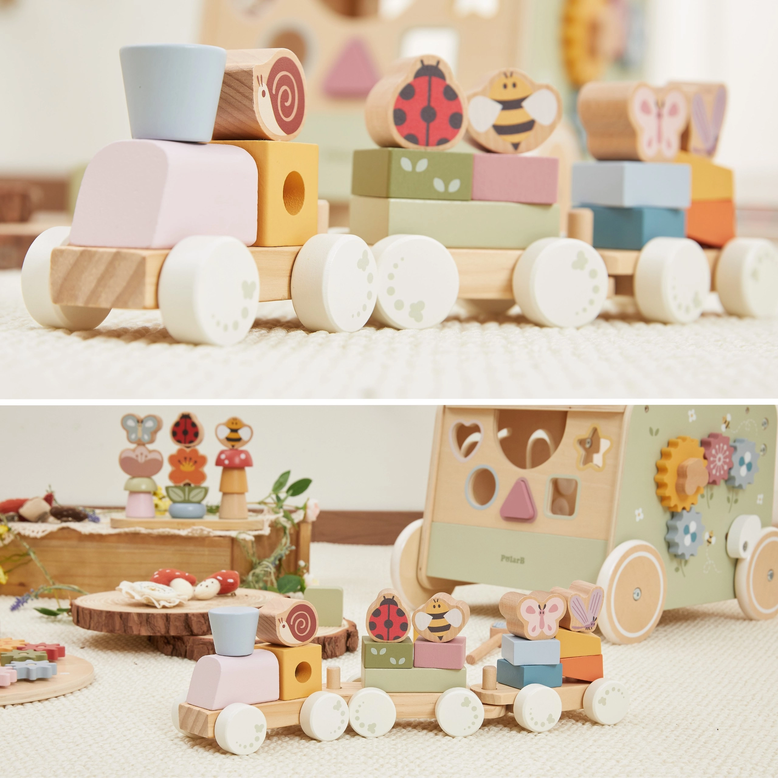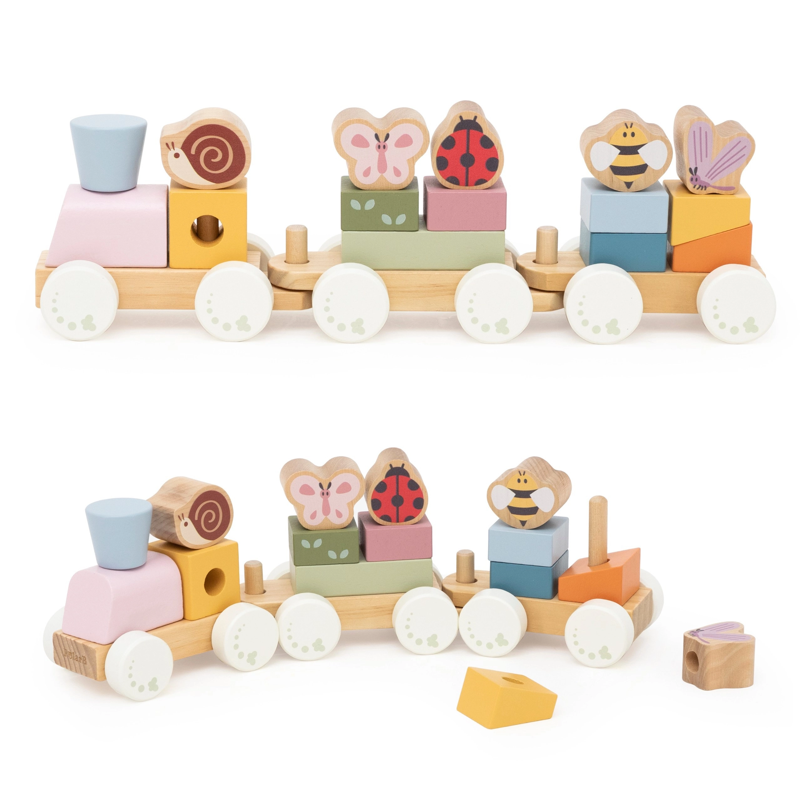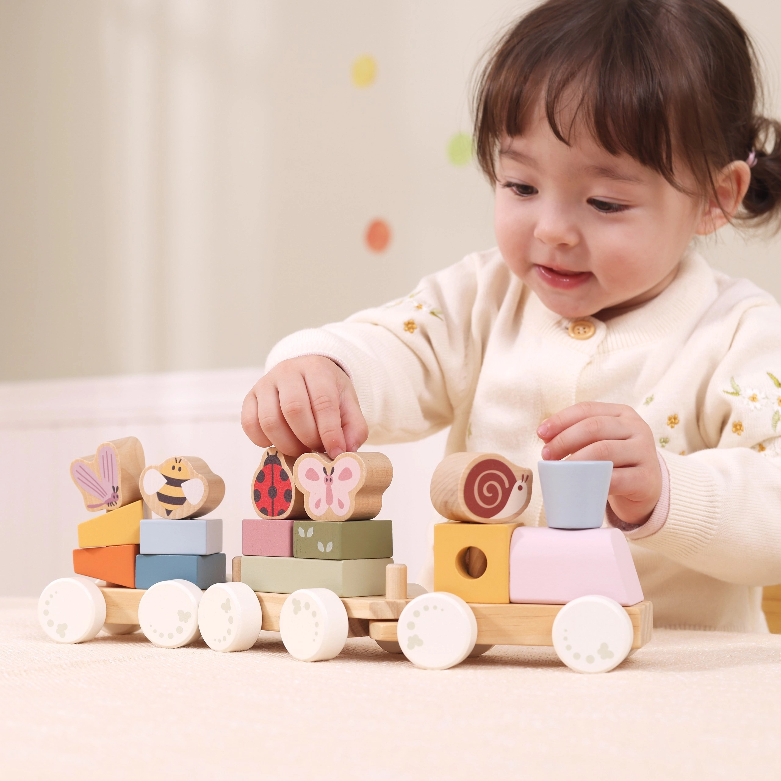 Drewniany pociąg do ciągnięcia z trzema wagonikami i 18 elementami jest idealny dla dzieci od 18 miesięcy. Dzięki różnym kształtom i motywom zwierząt (pszczoła, motyl, biedronka, ślimak) dzieci uczą się rozpoznawać kolory i kształty, ćwiczą małą motorykę oraz koordynację ręka–oko. Gładkie drewniane wykonanie i delikatne barwy są przyjemne w dotyku i dla oka.