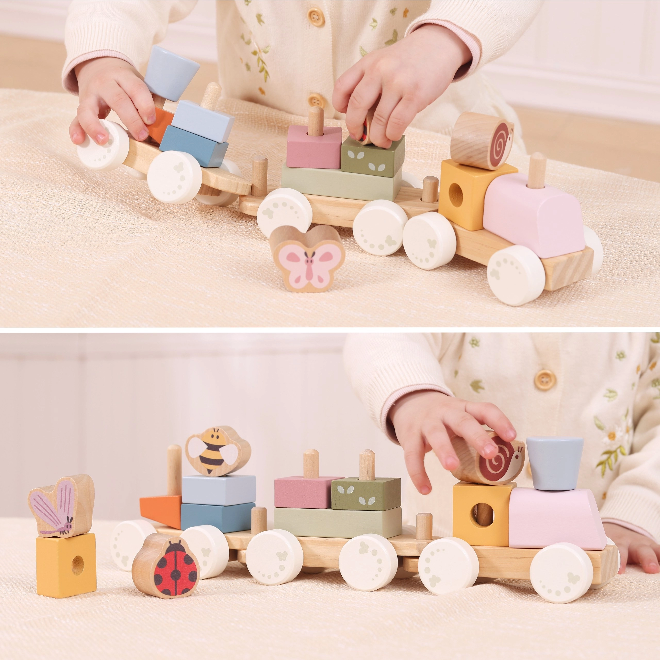 Każdy wagonik ma kołeczki do układania warstwowego i sortowania klocków, które można dowolnie łączyć, tworząc własne zestawy. Wagoniki można łatwo rozłączyć, a dziecko może bawić się nimi także osobno. Trwała drewniana konstrukcja zapewnia długą żywotność i bezpieczną zabawę.
