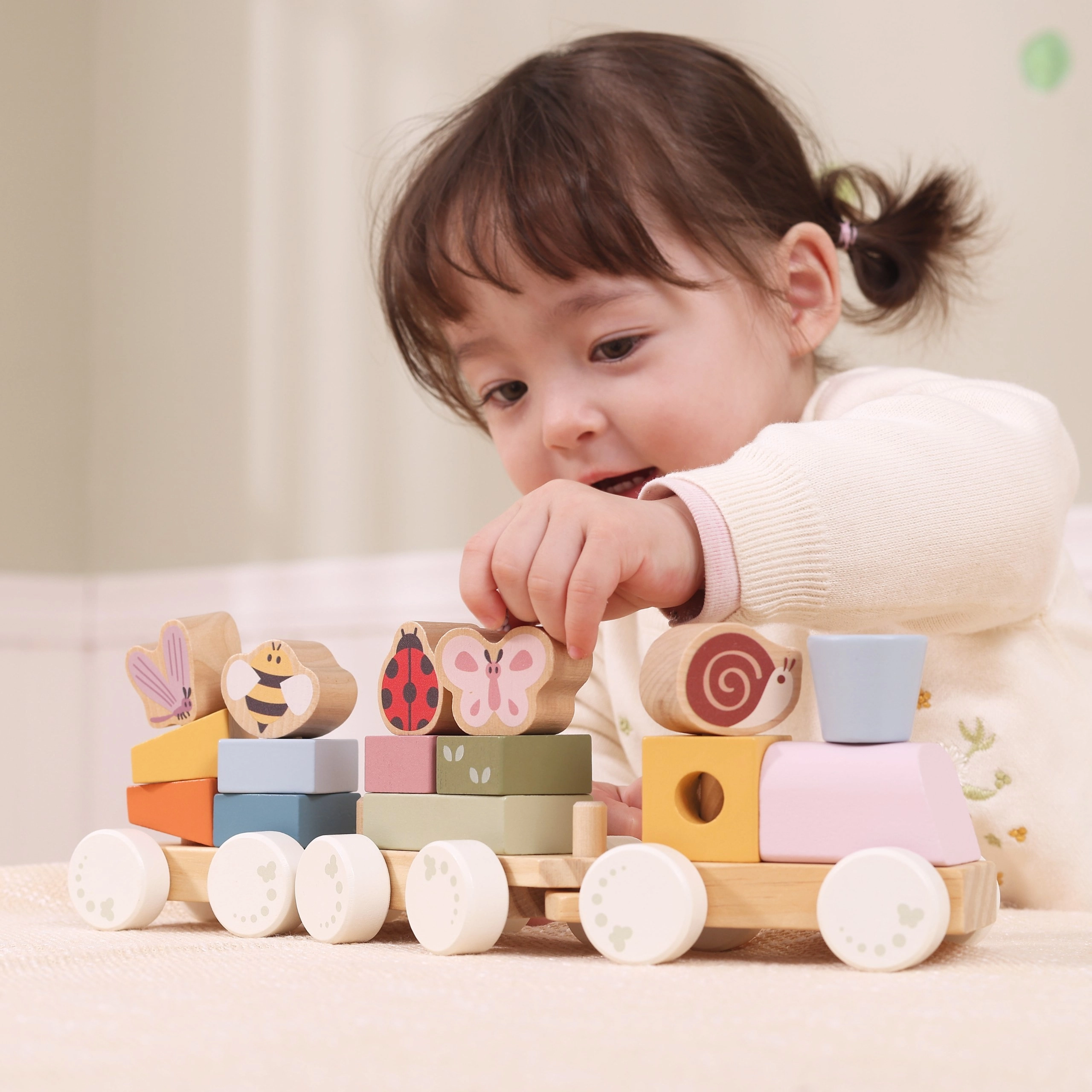 Kołeczki na wagonikach pozwalają swobodnie łączyć klocki i motywy owadów, dzięki czemu dzieci ćwiczą kolory, kształty oraz wyobraźnię przestrzenną.