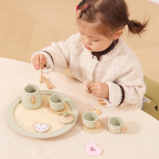 Kompletne wyposażenie, w tym dzbanek, filiżanki, cukiernica, łyżeczki, desery i taca, zachęca dzieci do zabawy w naśladowanie, dzielenia się i nauki dobrych manier.