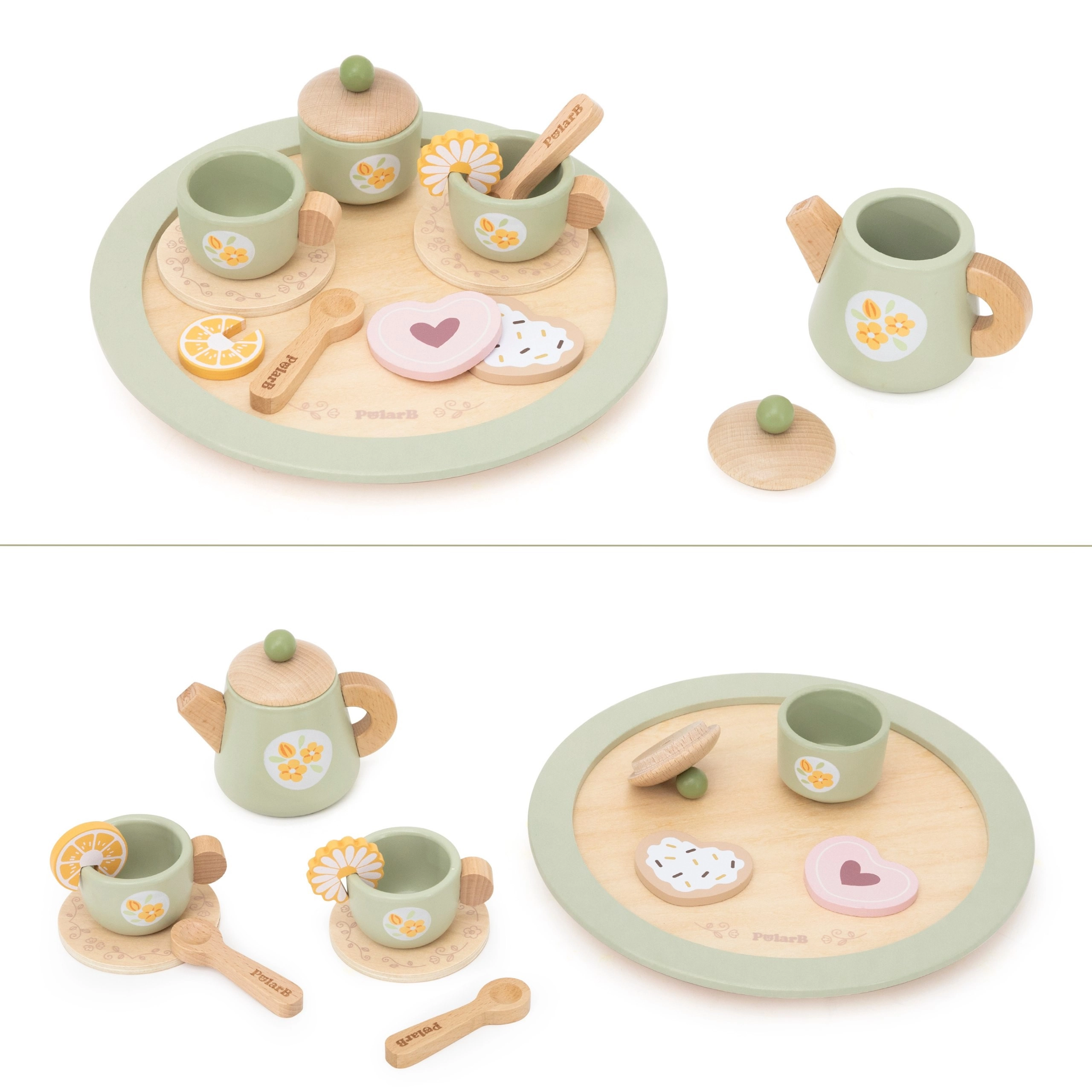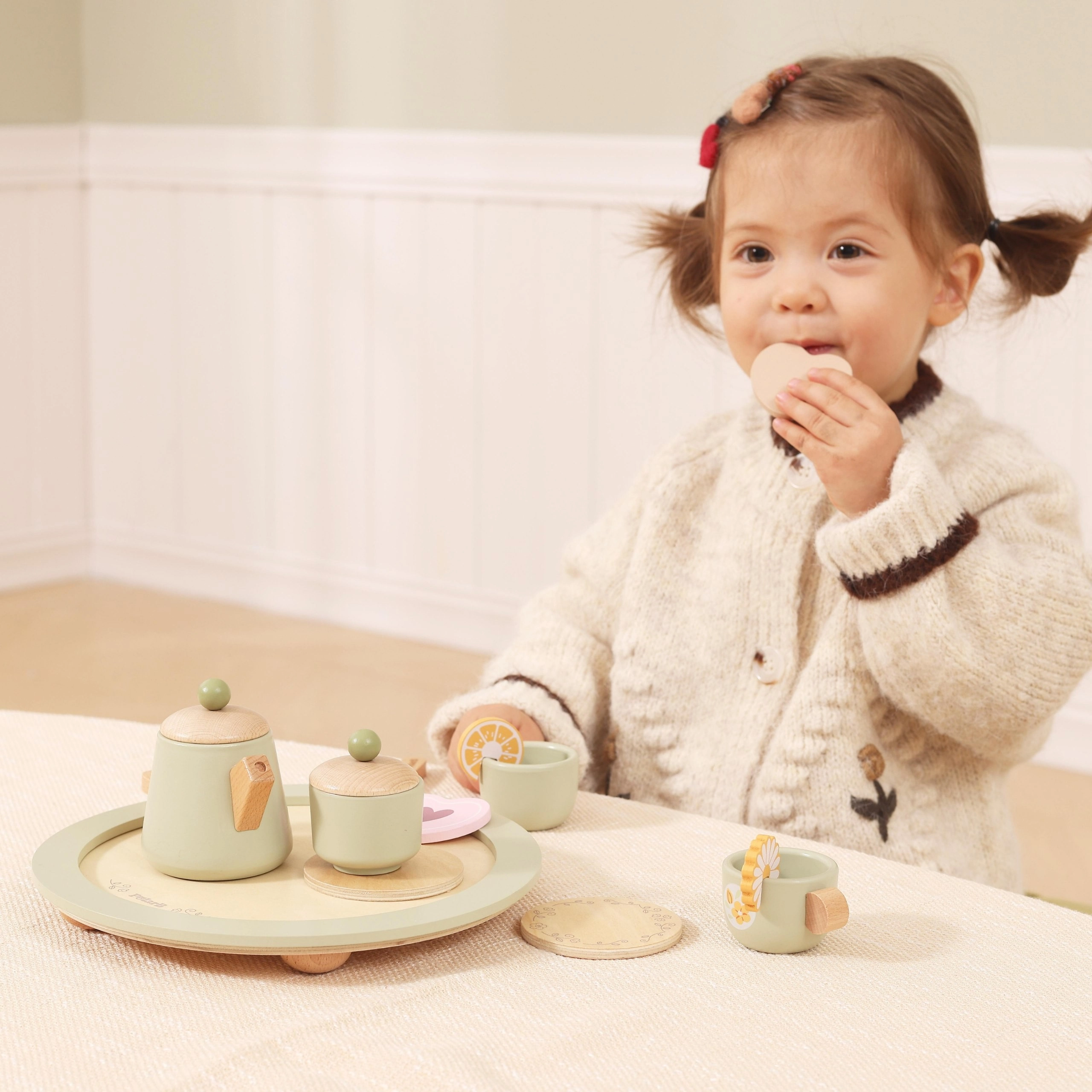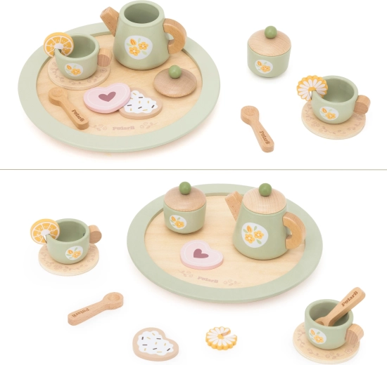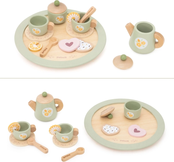 W komplecie jest wszystko do małego podwieczorku: dzbanek z pokrywką, cukiernica, 2 filiżanki ze spodkami, łyżeczki, talerzyk deserowy, plastry cytryny i ciasteczka oraz przede wszystkim stabilna, okrągła taca do łatwego serwowania. Wszystko wykonane z wysokiej jakości drewna i pokryte nietoksycznymi farbami bezpiecznymi dla dzieci od 3 lat.