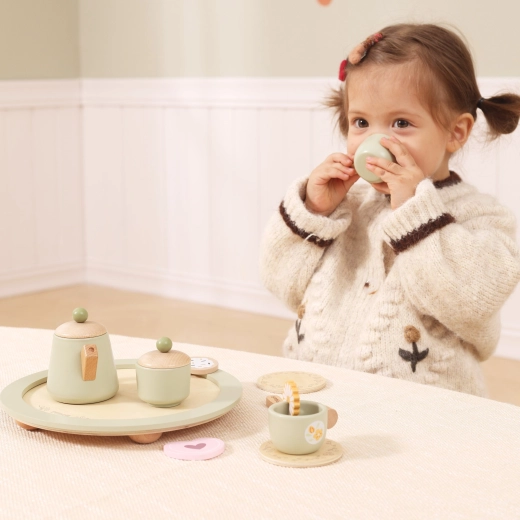 Drewniany zestaw do herbaty Viga wprowadza dzieci w urok klasycznej zabawy w dom w nowoczesnym, skandynawskim stylu. Delikatna pastelowa zieleń, naturalne drewno oraz subtelne kwiatowe i cytrynowe detale czynią z niego piękny dodatek do dziecięcego pokoju. Zabawa wspiera rozwój małej motoryki, współpracy i wyobraźni.