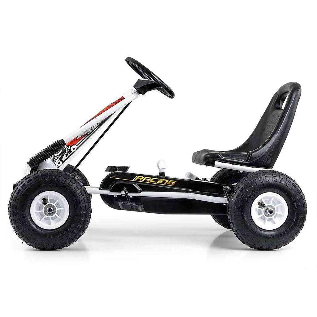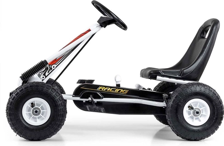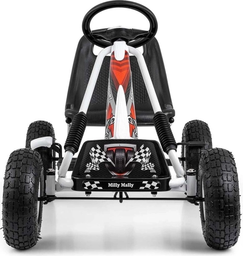 Gokart MILLY MALLY Thor to świetny wybór dla małych rajdowców w wieku 3–8 lat. Lekka, a jednocześnie wytrzymała metalowa konstrukcja z plastikowymi osłonami nadaje sportowy wygląd i odporność. Dzięki dużym pneumatycznym kołom z wyraźnym bieżnikiem jazda jest stabilna i komfortowa na asfalcie, kostce czy utwardzonych ścieżkach.