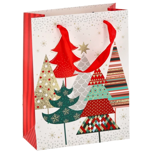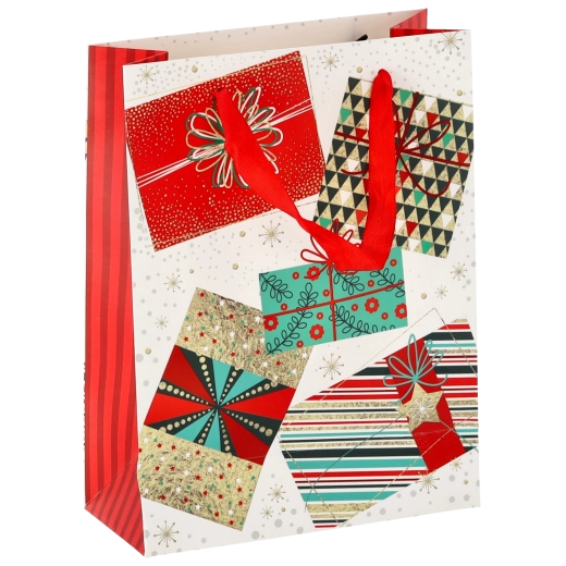 Uniwersalny format 18 × 24 × 8 cm jest perfekcyjny na małe i średniej wielkości upominki – od książek i kosmetyków po modowe akcesoria. Motywy Świąt w czerwonych, zielonych i złotych tonach tworzą uroczystą atmosferę, która cieszy już w chwili wręczania.