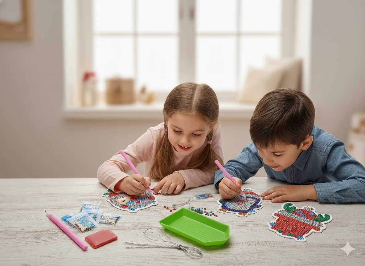 Odkryj łatwy i przyjemny sposób na własnoręcznie wykonane świąteczne dekoracje. Zestaw zawiera wszystko, czego potrzebujesz: samoprzylepne szablony, akrylowe kamyczki, tackę, wosk oraz aplikator. Wystarczy postępować według symboli, umieszczać kamyczki i w kilka chwil powstaną połyskujące ozdoby 3D, które rozświetlą każdy kąt domu.