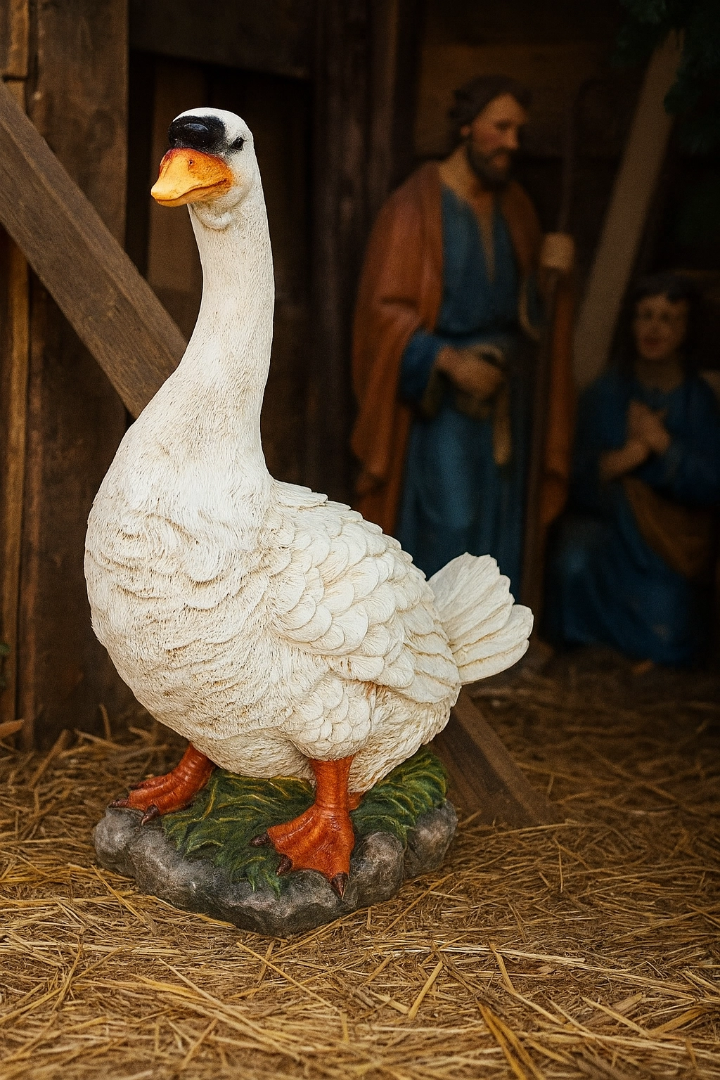 Stwórz wyrazistą, świąteczną scenę z realistyczną figurką gęsi 51 cm, która doskonale uzupełni szopkę, witrynę sklepową lub tematyczną ekspozycję. Precyzyjna struktura piór, pomarańczowy dziób i nogi oraz naturalna podstawa z motywem trawy prezentują się autentycznie i estetycznie.