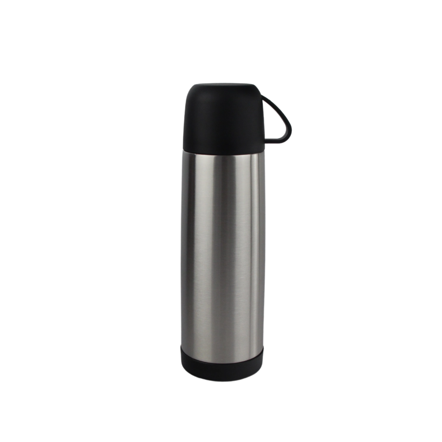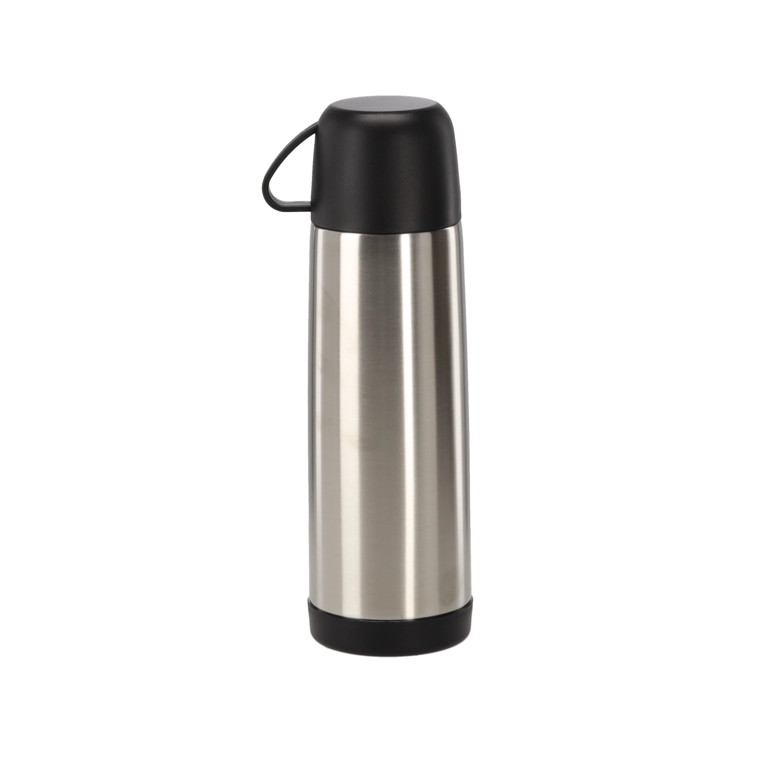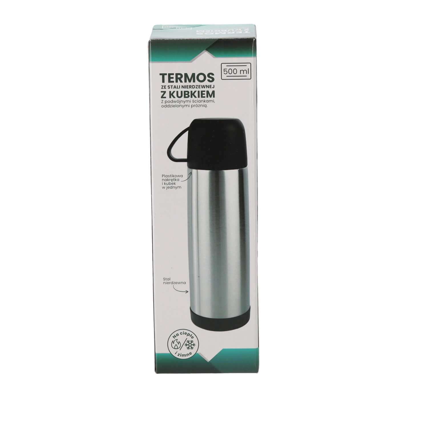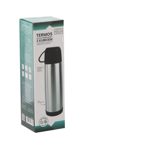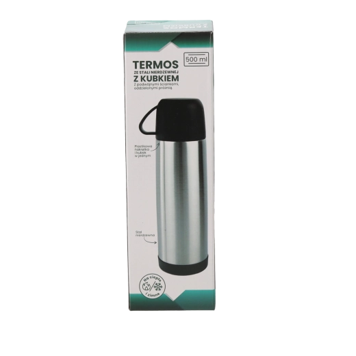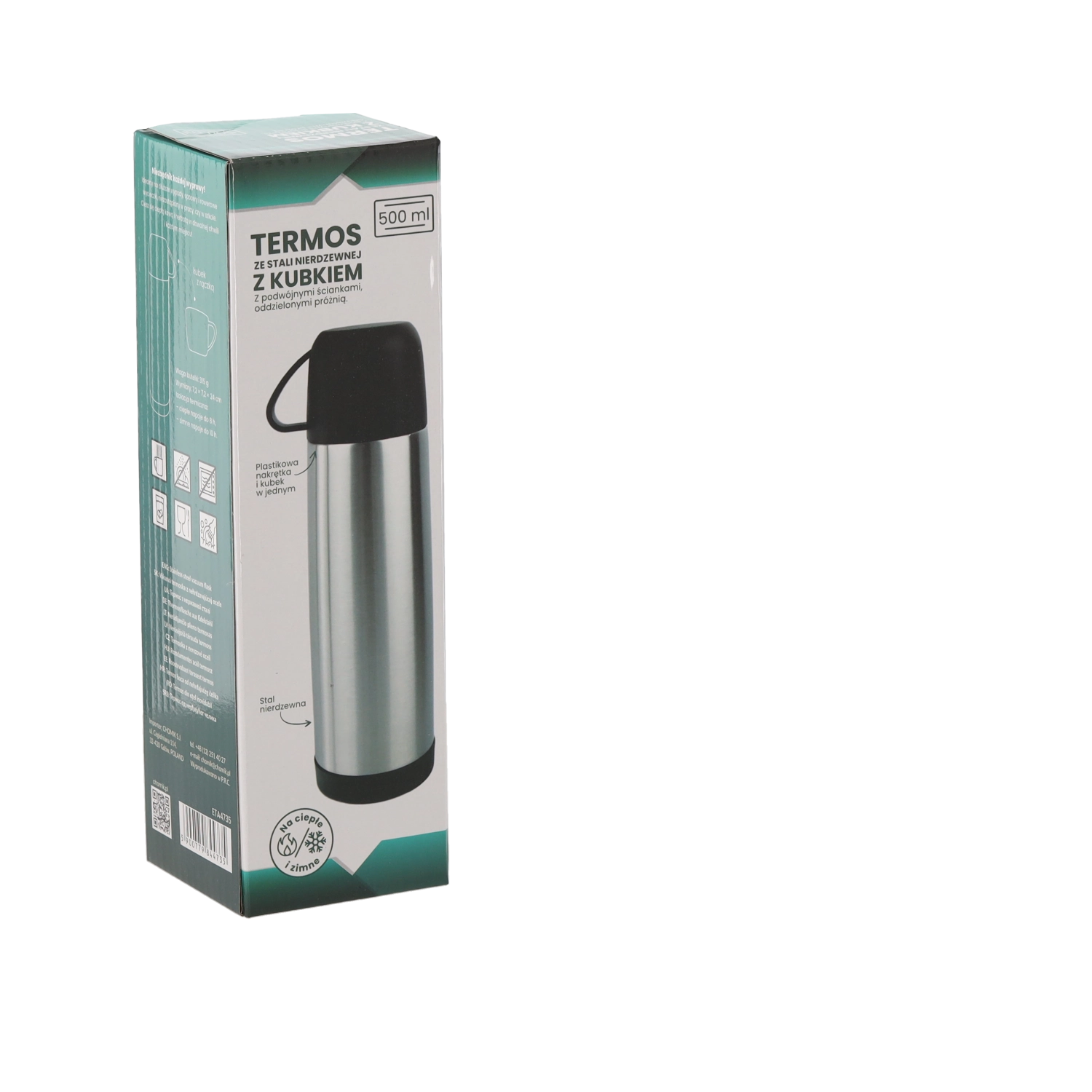 Praktyczny termos z kubkiem o pojemności 500 ml do codziennego użytku. Dzięki dwuwarstwowej stali nierdzewnej utrzymuje napoje długo ciepłe – z 96 °C do 38–40 °C po 24 godzinach. W zestawie wytrzymały plastikowy kubek dla wygodnego picia w podróży.