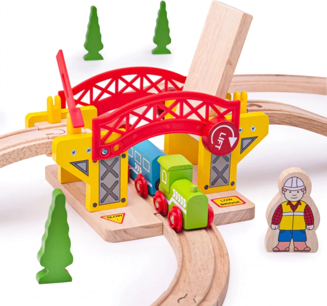 Ciesz się świetną zabawą z drewnianym podnoszonym mostem, który przyciągnie uwagę każdego małego inżyniera budowlanego. Podnoszony most i przejeżdżające pociągi zachwycą dziecięcą wyobraźnię.