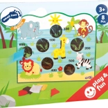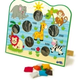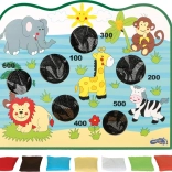 Plansza z kolorowymi ilustracjami zwierząt i kolorowe woreczki sprawiają, że gra jest atrakcyjna i zabawna dla dzieci.