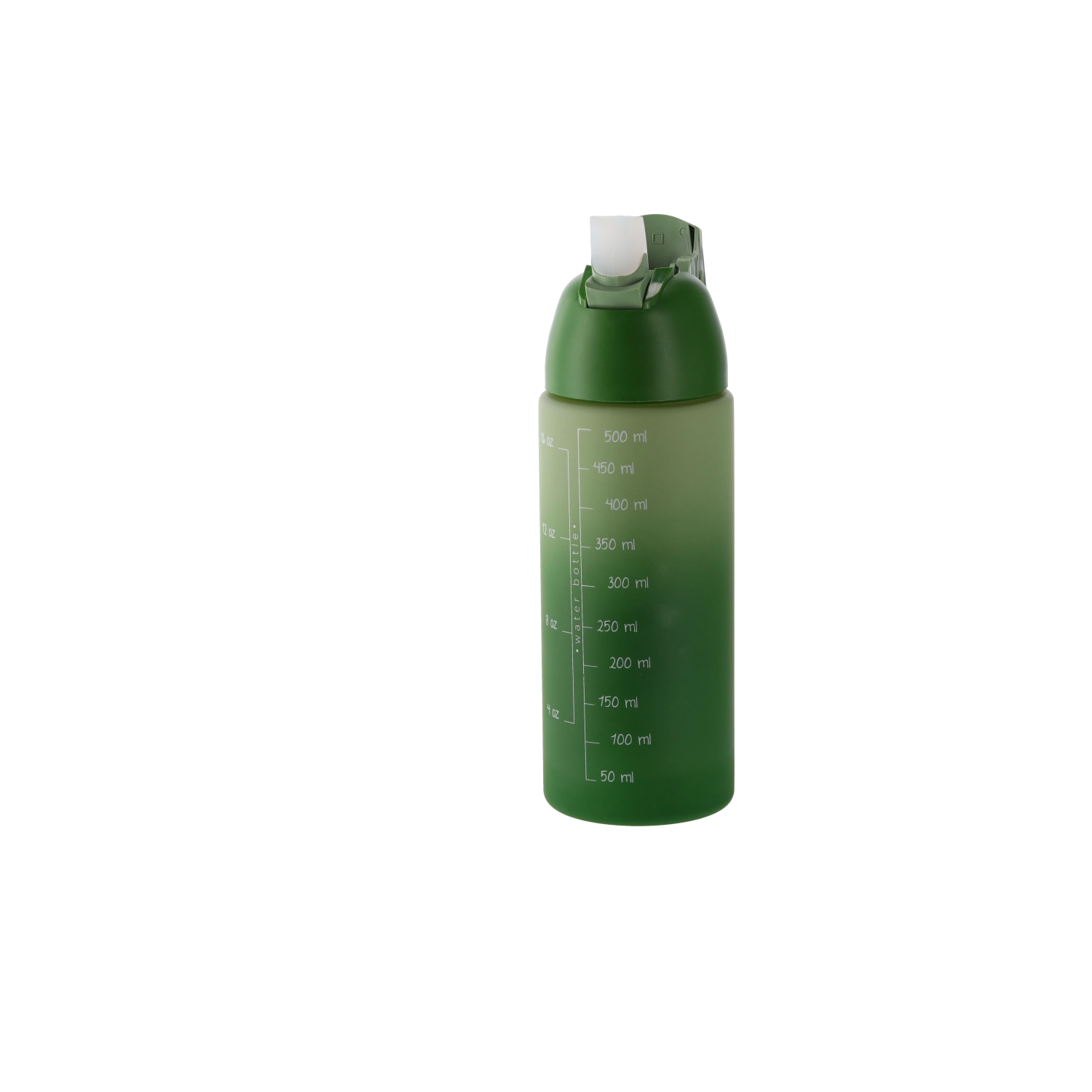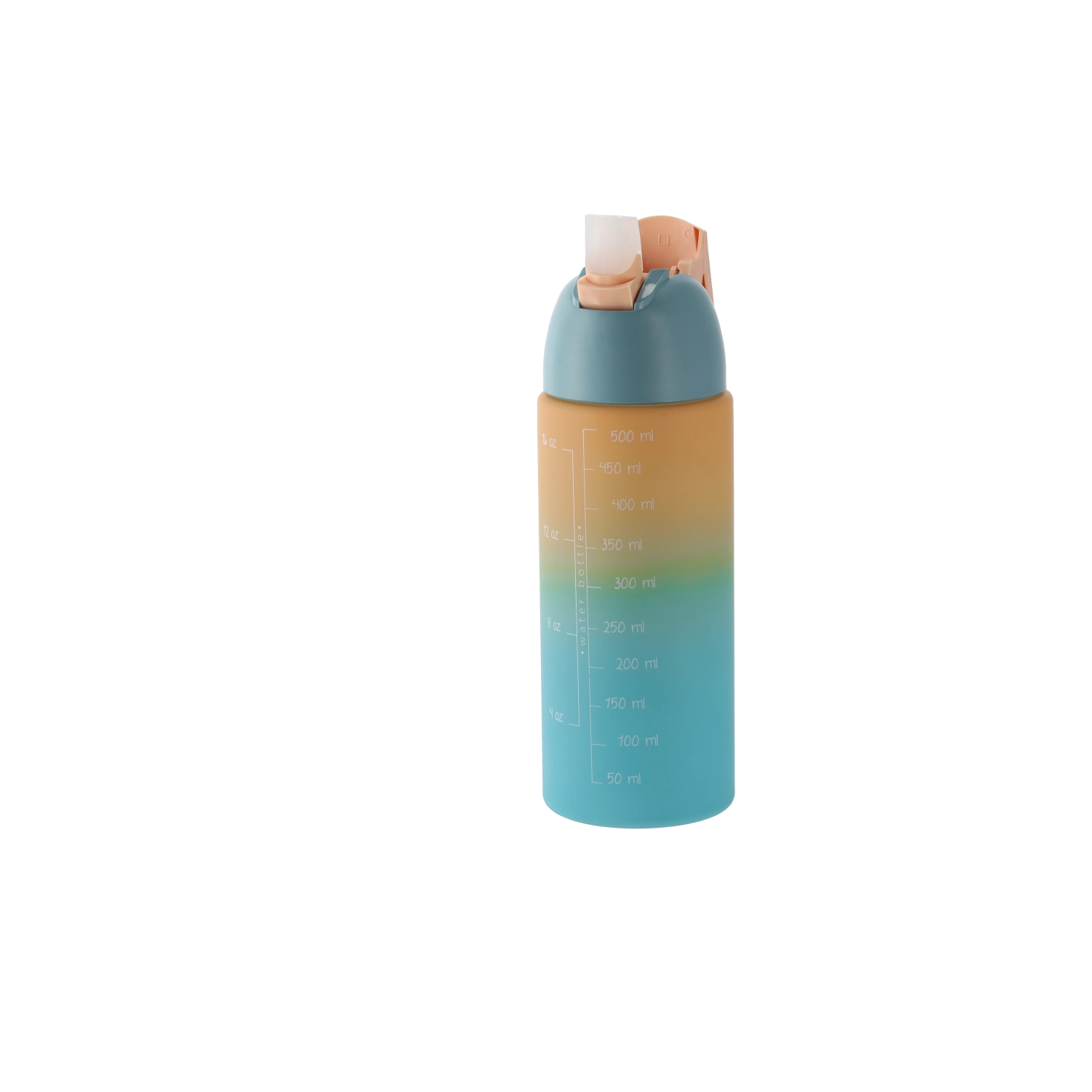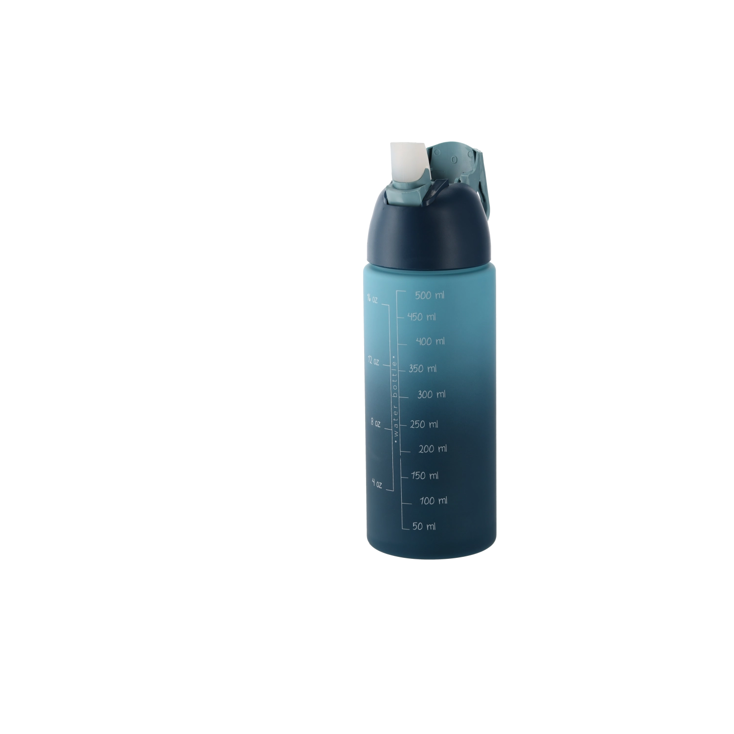 Stylowa sportowa butelka na wodę o pojemności 500 ml w niebieskim wykończeniu ombré jest idealna do codziennego nawadniania w domu, w pracy i podczas aktywności. Dzięki wieczku typu flip-top oraz szczelnemu zamknięciu wygodnie się z niej pije bez rozlewania, a przezroczyste korpus z podziałką pomaga kontrolować spożycie płynów. Lekki i wytrzymały materiał PC sprawdzi się w podróży i w plecaku.