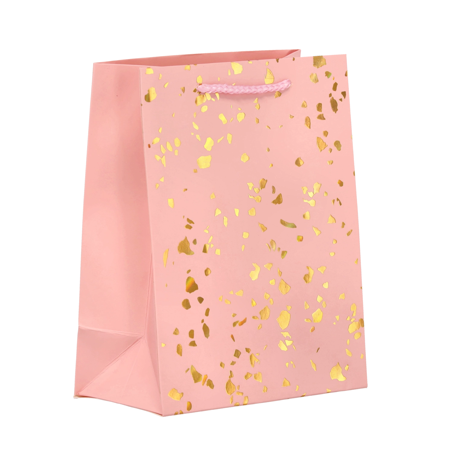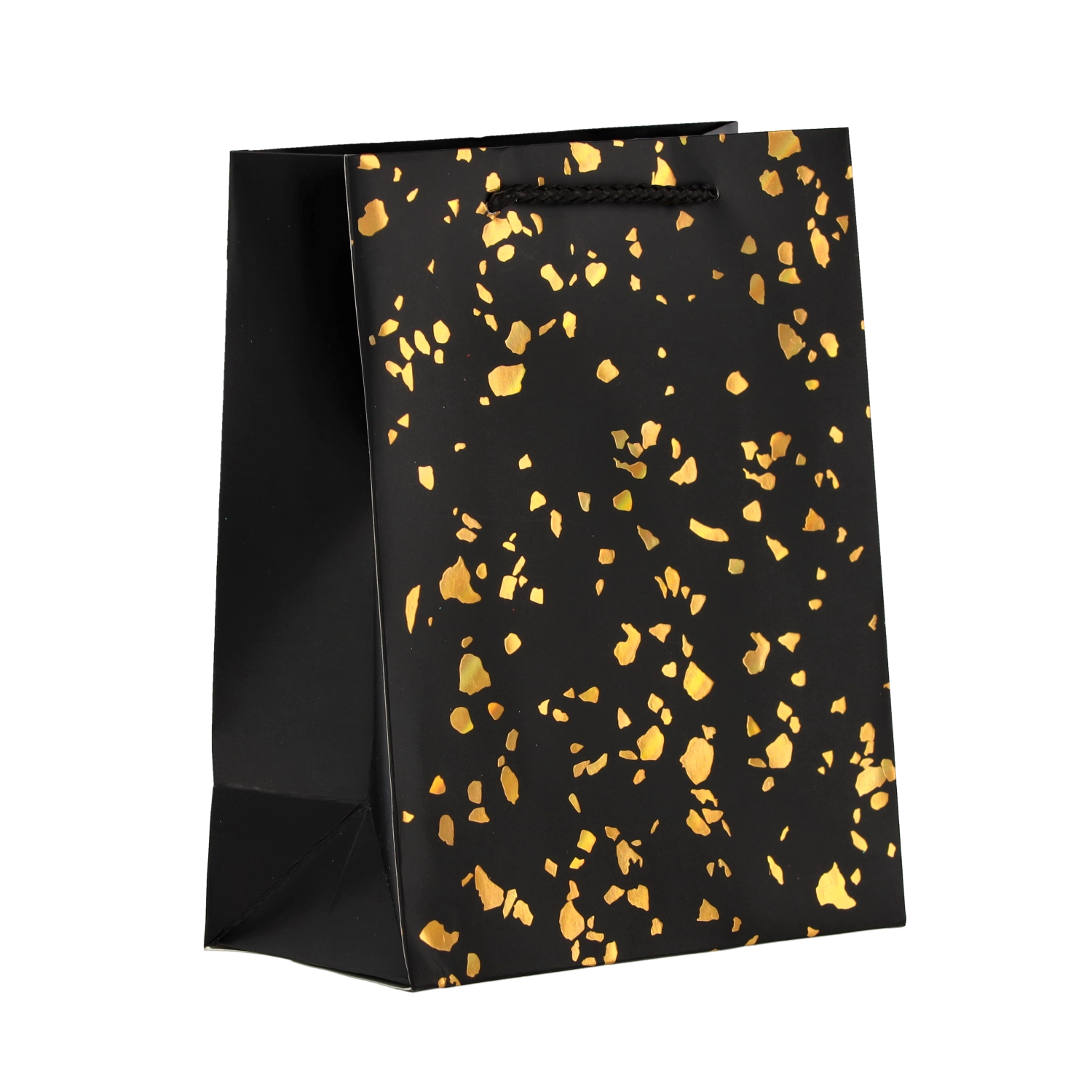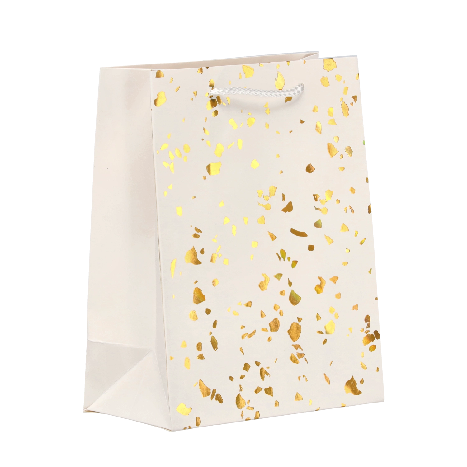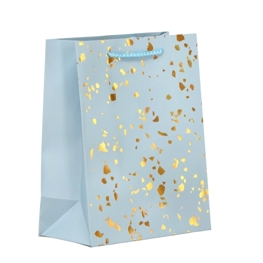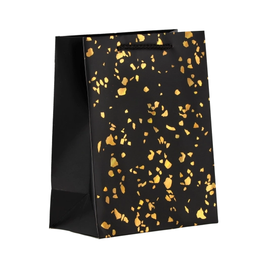 Ta torebka prezentowa wyróżnia się ponadczasowym designem ze złotymi kropkami na jednolitym tle. Wykonana z mocnego ozdobnego kartonu, który wytrzyma wielokrotne użycie i zachowa reprezentacyjny wygląd. Kolorystycznie dopasowane sznurkowe uchwyty zapewniają wygodne i bezpieczne przenoszenie.