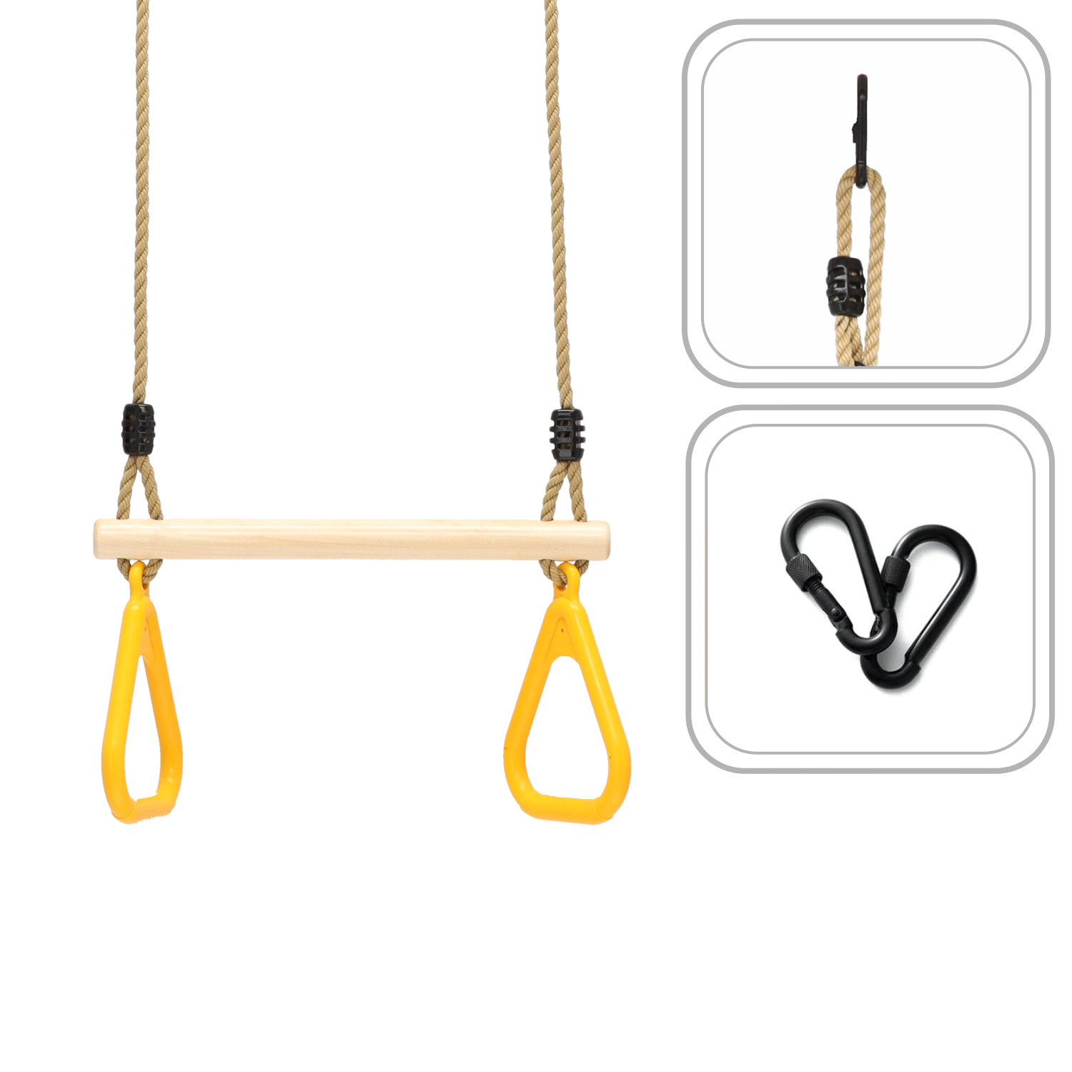 Wytrzymałe liny i metalowe karabińczyki/zawiesia gwarantują niezawodne mocowanie do ogrodowych ram A oraz zestawów zabawowych.