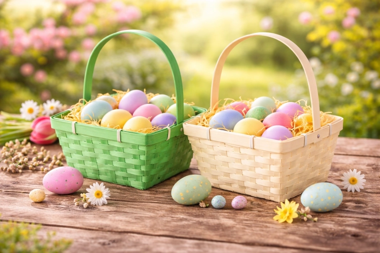 Koszyczki dostarczane są w miksie 2 kolorów, które harmonijnie się uzupełniają i tworzą świeży, wiosenny nastrój. Idealne do domowych dekoracji i pakowania prezentów.