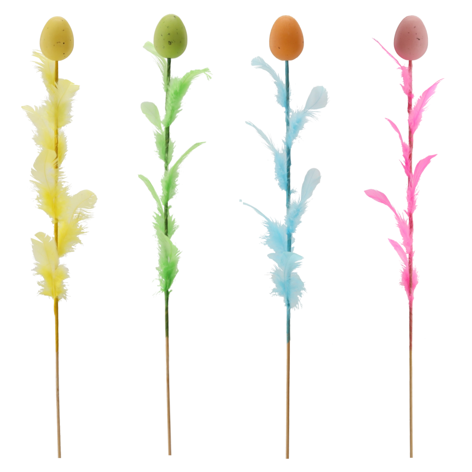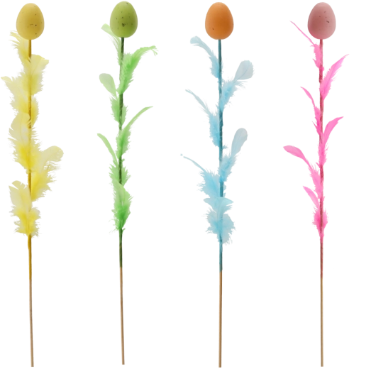 Stwórz przytulny, wiosenny nastrój w domu dzięki dekoracyjnemu jajku na piku. Dzięki długości 45 cm łatwo wyróżni się w kompozycjach kwiatowych, skrzynkach oraz samodzielnie w wazonie. Mix czterech kolorów wprowadza świeżość i pozwala na zgranie z pozostałymi ozdobami, a piórka dodają subtelnego, eleganckiego akcentu.