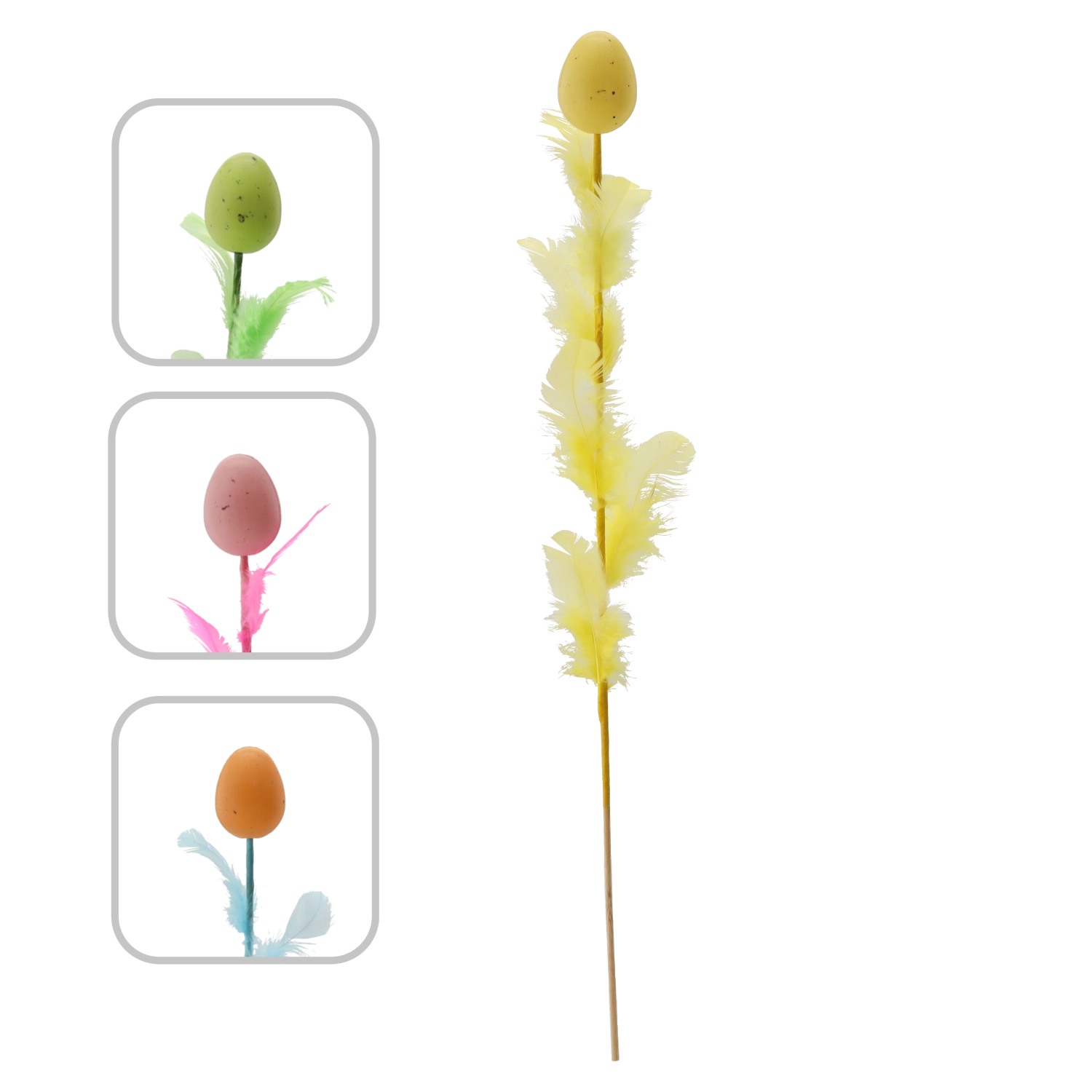 Elegancka wielkanocna dekoracja w kształcie jajka z piórkami na piku o długości 45 cm rozświetli Twoje świąteczne aranżacje. Oferuje mix czterech świeżych kolorów, które dodają wnętrzu różnorodności i wiosennej atmosfery. Delikatne piórka dla lekkości i zwiewności sprawiają, że to idealny wybór do bukietów, koszyków i wazonów.