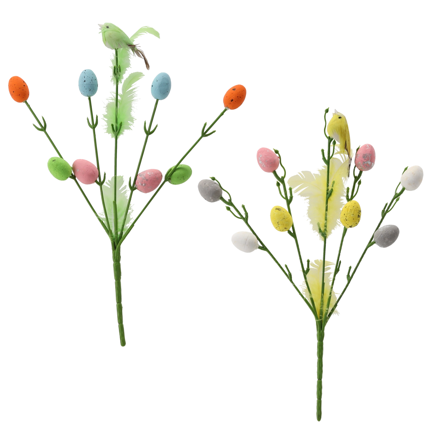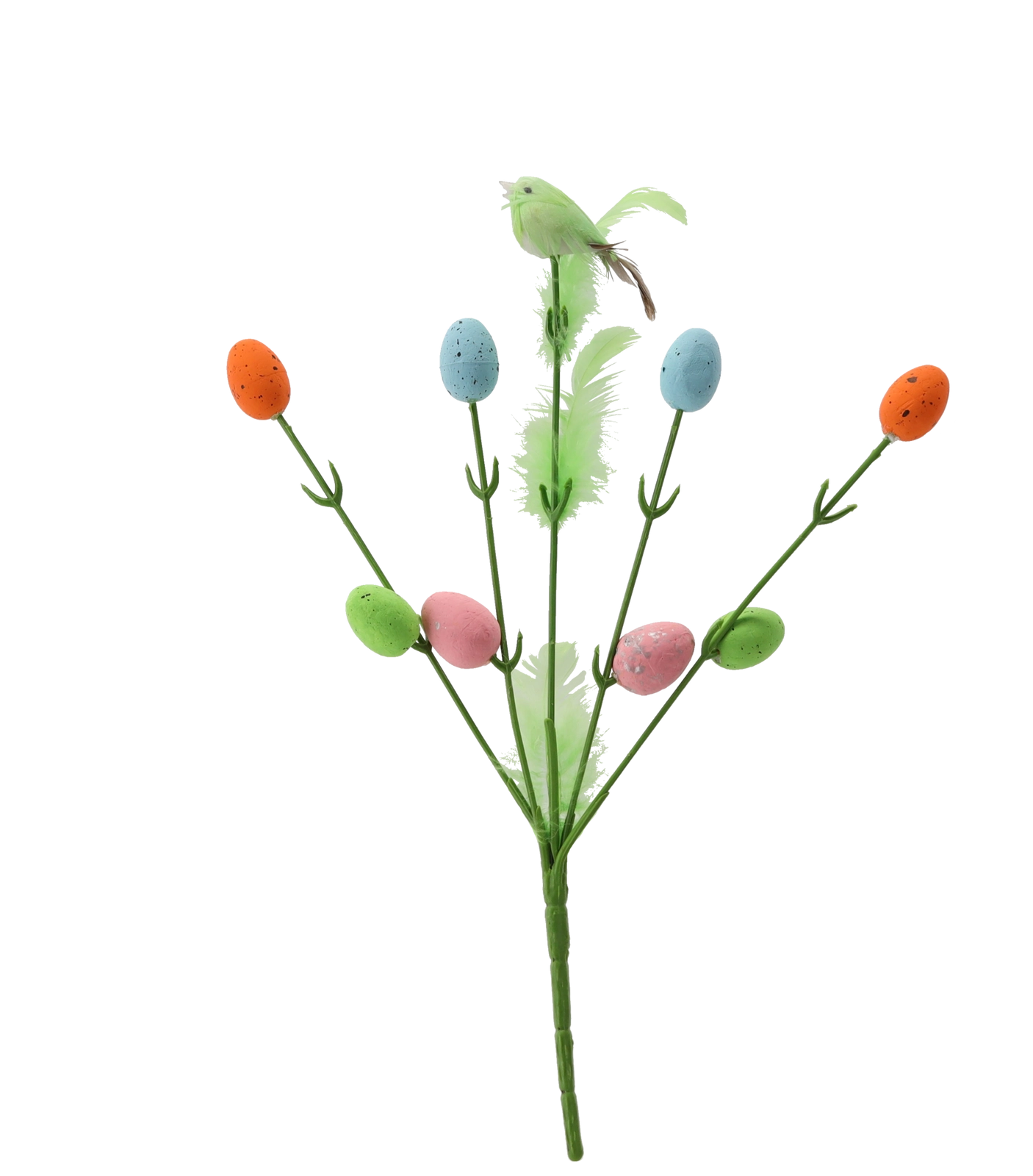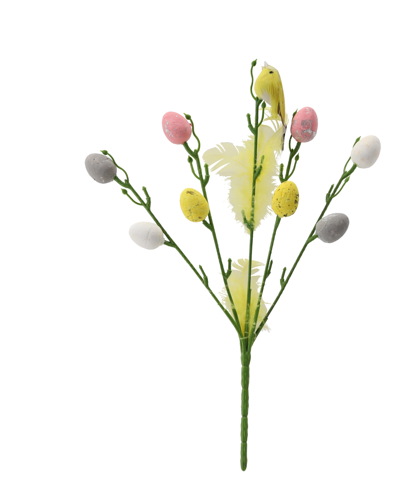 Ta wielkanocna dekoracja na patyczku łączy delikatną gałązkę, uroczego ptaszka i drobne jajeczka – symbole wiosny i nowego życia. Jest idealna do kompozycji kwiatowych, wieńców, dekoracji stołu, a także jako samodzielny akcent w wazonie. Dzięki uniwersalnemu designowi łatwo wpasuje się zarówno w tradycyjne, jak i nowoczesne wnętrza.