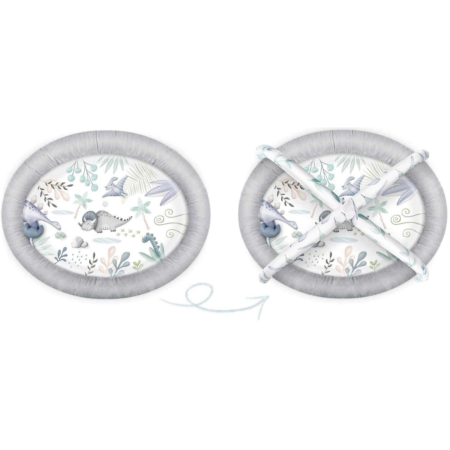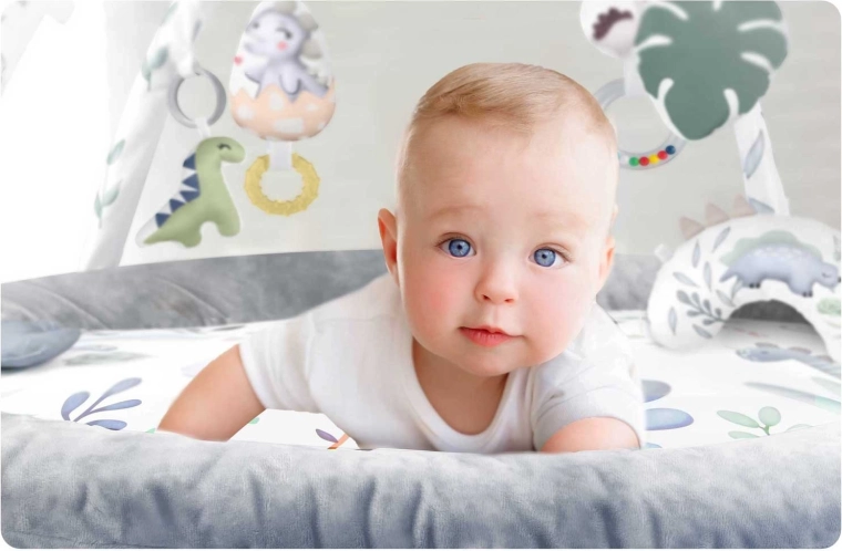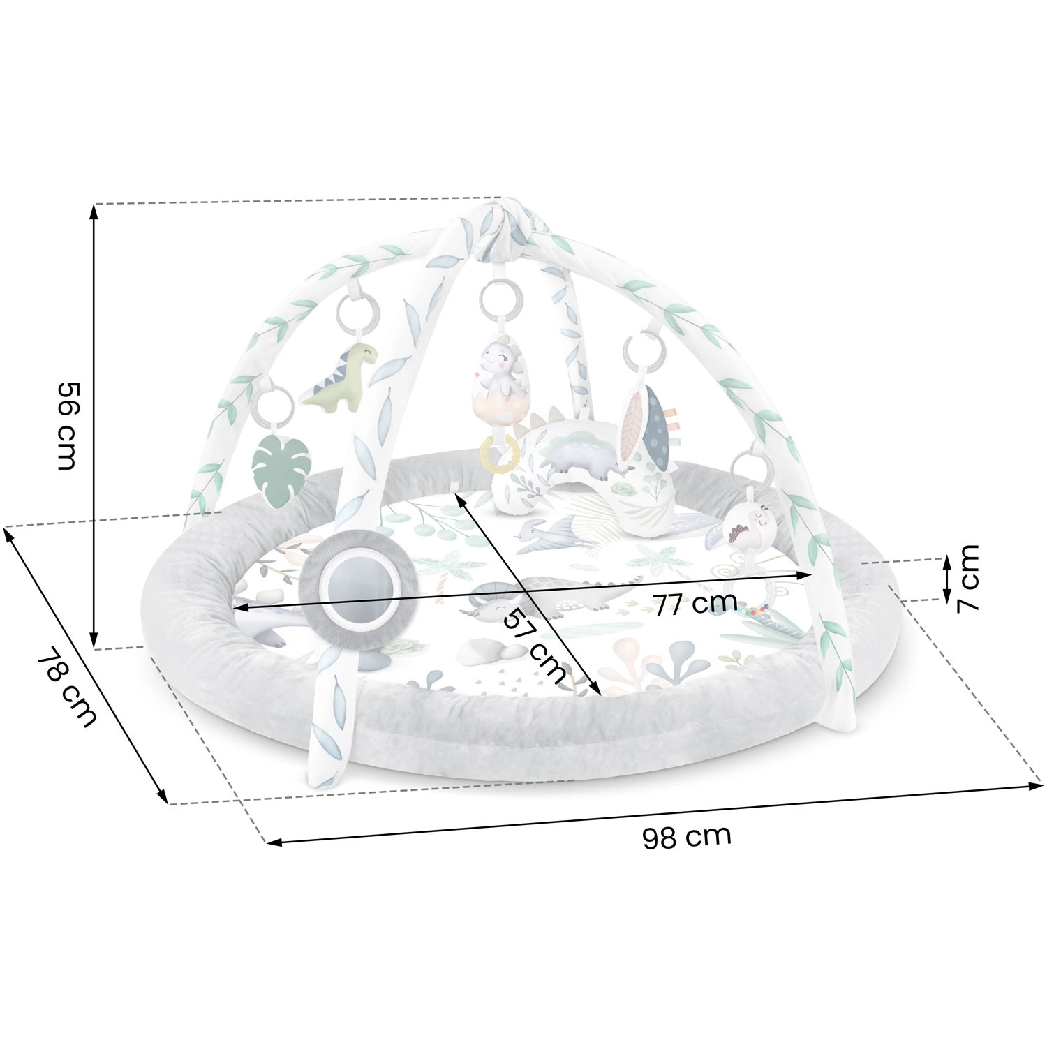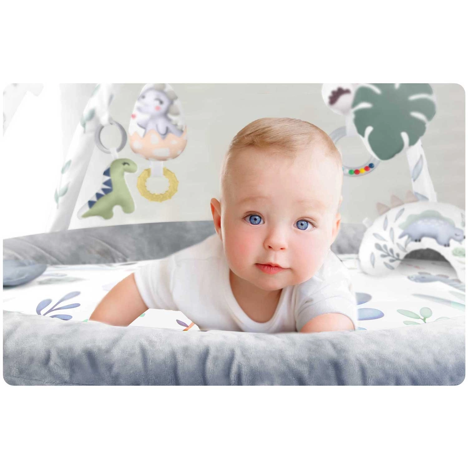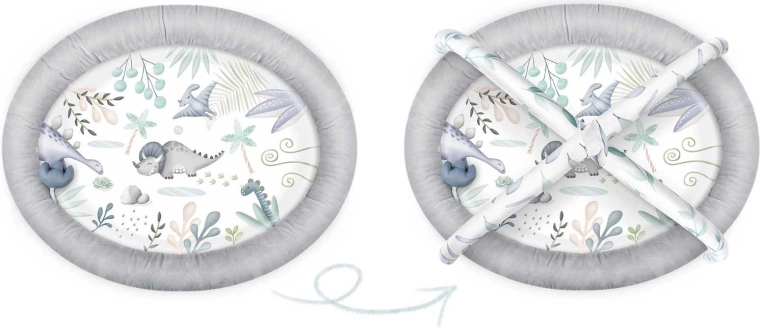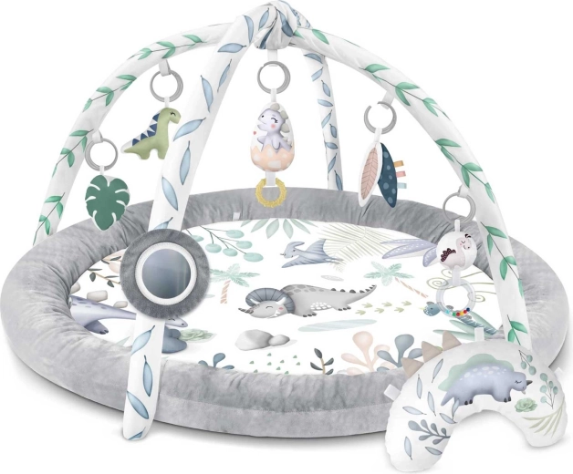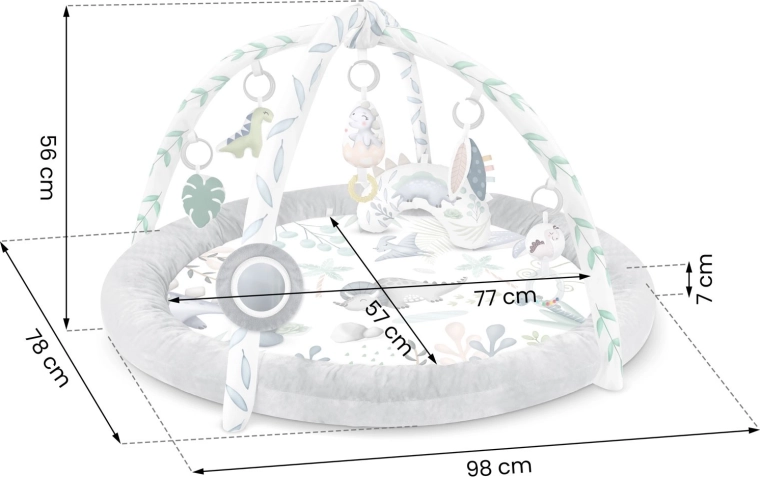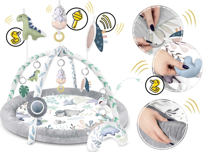 Dwa krzyżujące się pałąki są odpinane, co wydłuża możliwości użytkowania maty – jako przestrzeni do zabawy oraz samodzielnego gniazdka. W zestawie znajduje się mięciutka poduszka (tył z minky) idealna do „tummy time”, do której można przypiąć zabawki. Różnorodne faktury, szeleszczące detale, grzechotki, gryzaki i piszczący dinozaur wspólnie rozwijają małą motorykę, koordynację oko–ręka oraz wrażenia słuchowe i dotykowe.