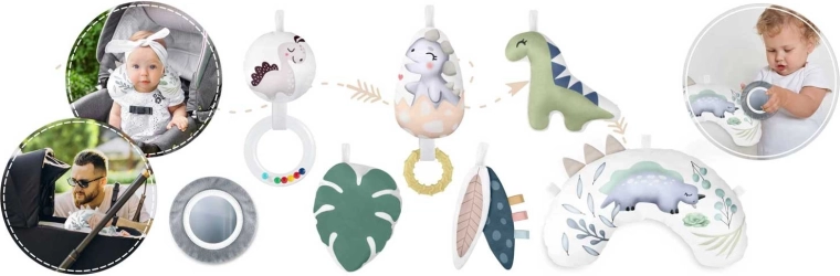 Lusterko, grzechotki, piszczący dinozaur, szeleszczące listki i elementy do gryzienia wspierają wzrok, słuch i dotyk. Zabawki łatwo przepinać w różne miejsca.