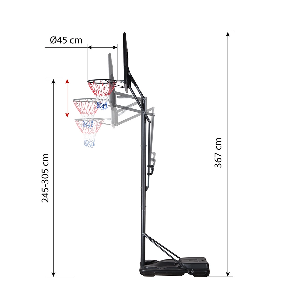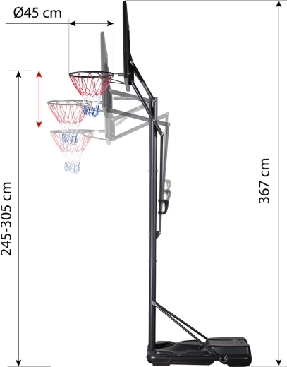 - Regulowana wysokość obręczy 2,45–3,05 m w 5 poziomach
