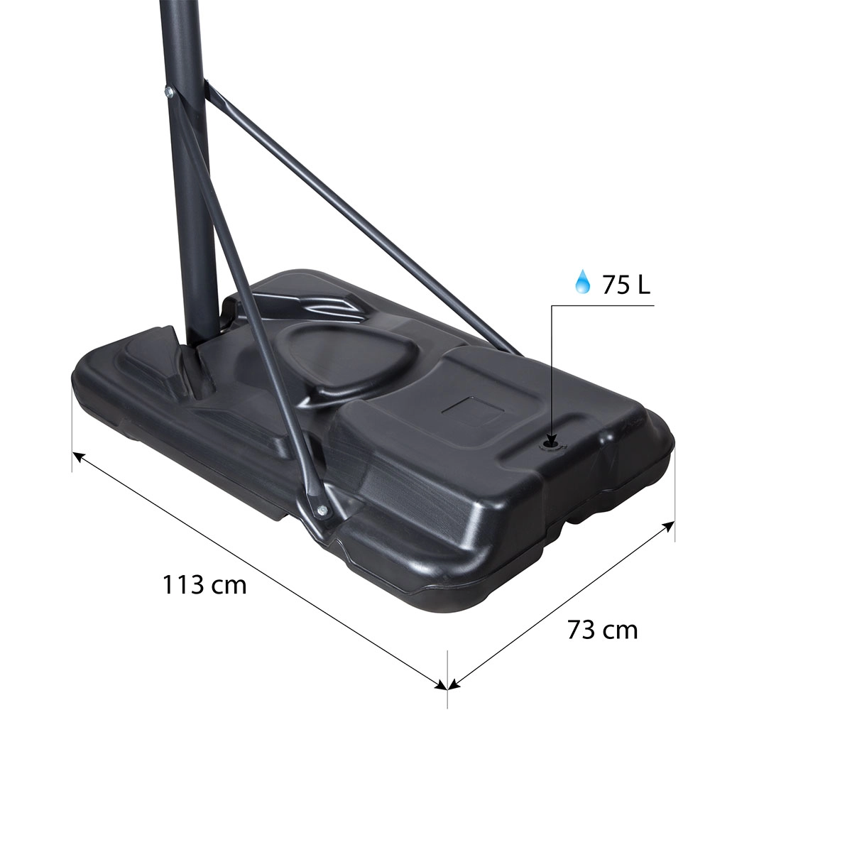 - Stabilna podstawa 113 × 73 cm – pojemność 75 l wody
