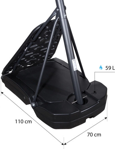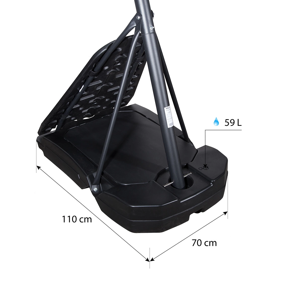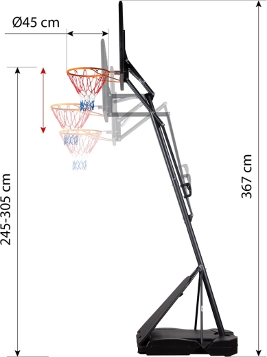 Podstawa o wymiarach 110 × 70 cm mieści 59 litrów wody dla maksymalnej stabilności i jest wyposażona w kółka ułatwiające manewrowanie. Pod tablicą znajduje się powierzchnia odbijająca do treningu podań. Obręcz o średnicy 45 cm jest amortyzowana za pomocą 2 mocnych sprężyn, co wydłuża jej żywotność i poprawia komfort gry.