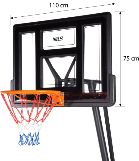 Solidny kosz do koszykówki NILS ZDK520 do gry na zewnątrz i w pomieszczeniach oferuje regulowaną wysokość obręczy 2,45–3,05 m, wytrzymałą przezroczystą tablicę 110 × 75 cm oraz stalową sprężynowaną obręcz Ø 45 cm. Stabilność zapewnia podstawa na 59 l wody z kółkami do łatwego przemieszczania oraz płyta odbijająca do treningu podań.