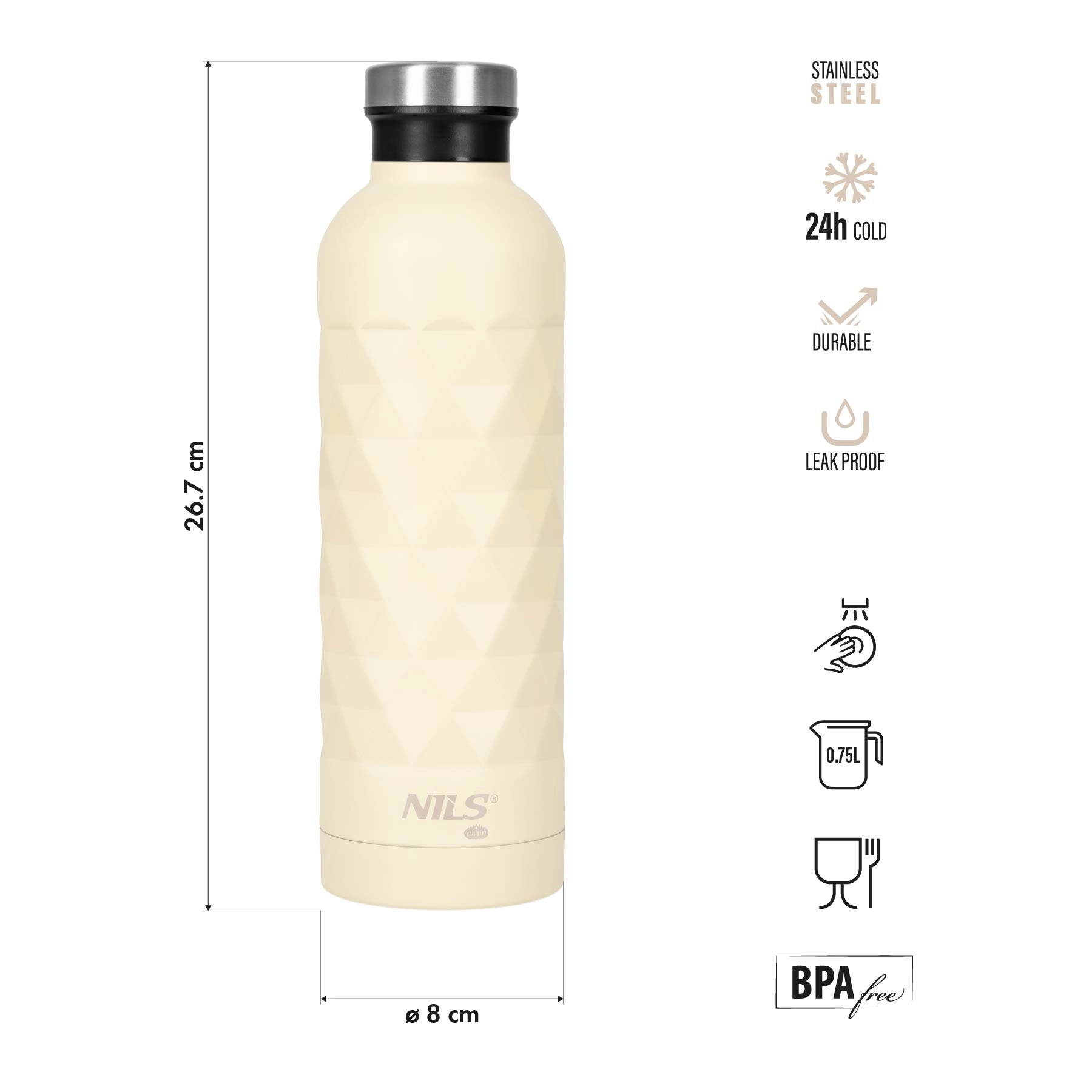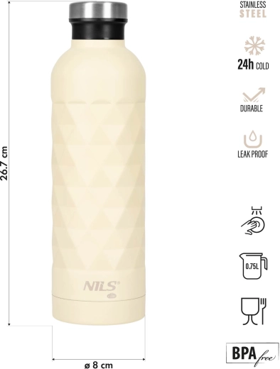 Termobutelka NILS Camp w beżowym kolorze to niezawodny towarzysz aktywnego dnia. Łączy nowoczesny design, trwałą konstrukcję ze stali nierdzewnej oraz praktyczne wymiary, które mieszczą się do plecaka i uchwytu na bidon. Teksturowana powierzchnia zapewnia pewny chwyt, a dzięki izolacji butelka nie wykrapla – pozostaje sucha w dotyku.