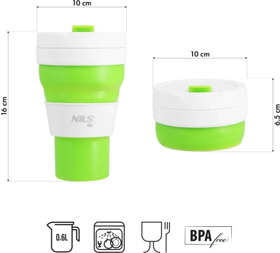 Lekki i praktyczny składany kubek o pojemności 600 ml jest idealny w podróż, na wędrówki i do miasta. Dzięki elastycznemu silikonowi składa się do wysokości jedynie 6,5–7 cm, więc nie zajmuje miejsca w plecaku. Wykonany z bezpiecznego silikonu LFGB, bez BPA, ma stabilną, szeroką podstawę, wieczko z ustnikiem przeciw rozlaniu oraz niską masę 205 g dla wygodnego noszenia.