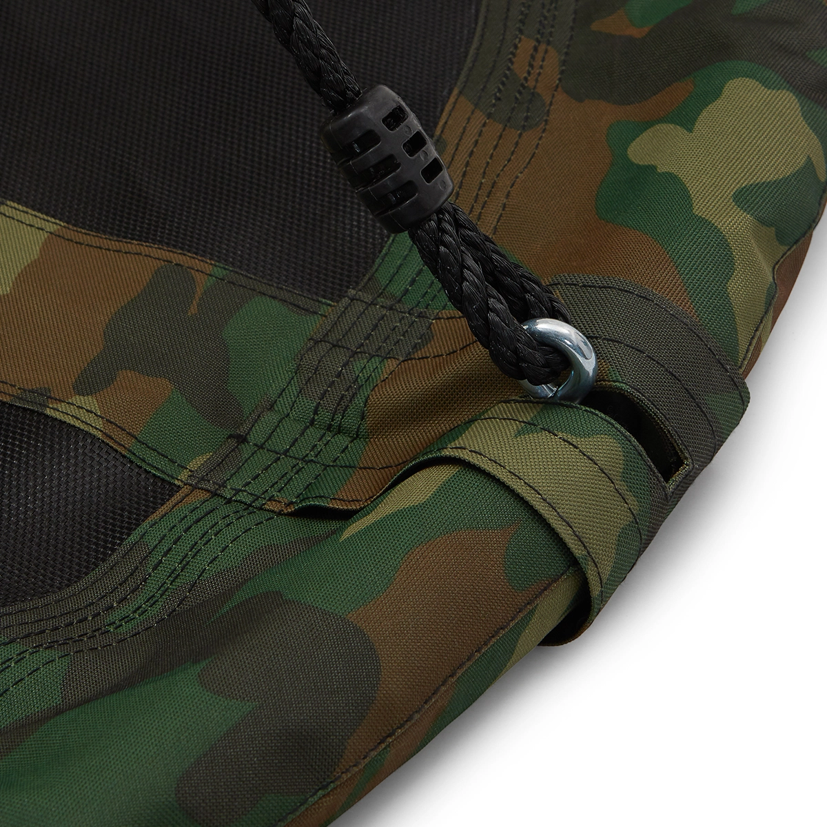 Pokrycie z wytrzymałej tkaniny Oxford 600D w połączeniu z polipropylenem świetnie znosi warunki atmosferyczne, więc nie trzeba jej chować podczas przelotnego deszczu. Cztery solidne liny z polietylenu (Ø 10 mm, długość 180 cm) zapewniają stabilne zawieszenie na drzewie lub stelażu.