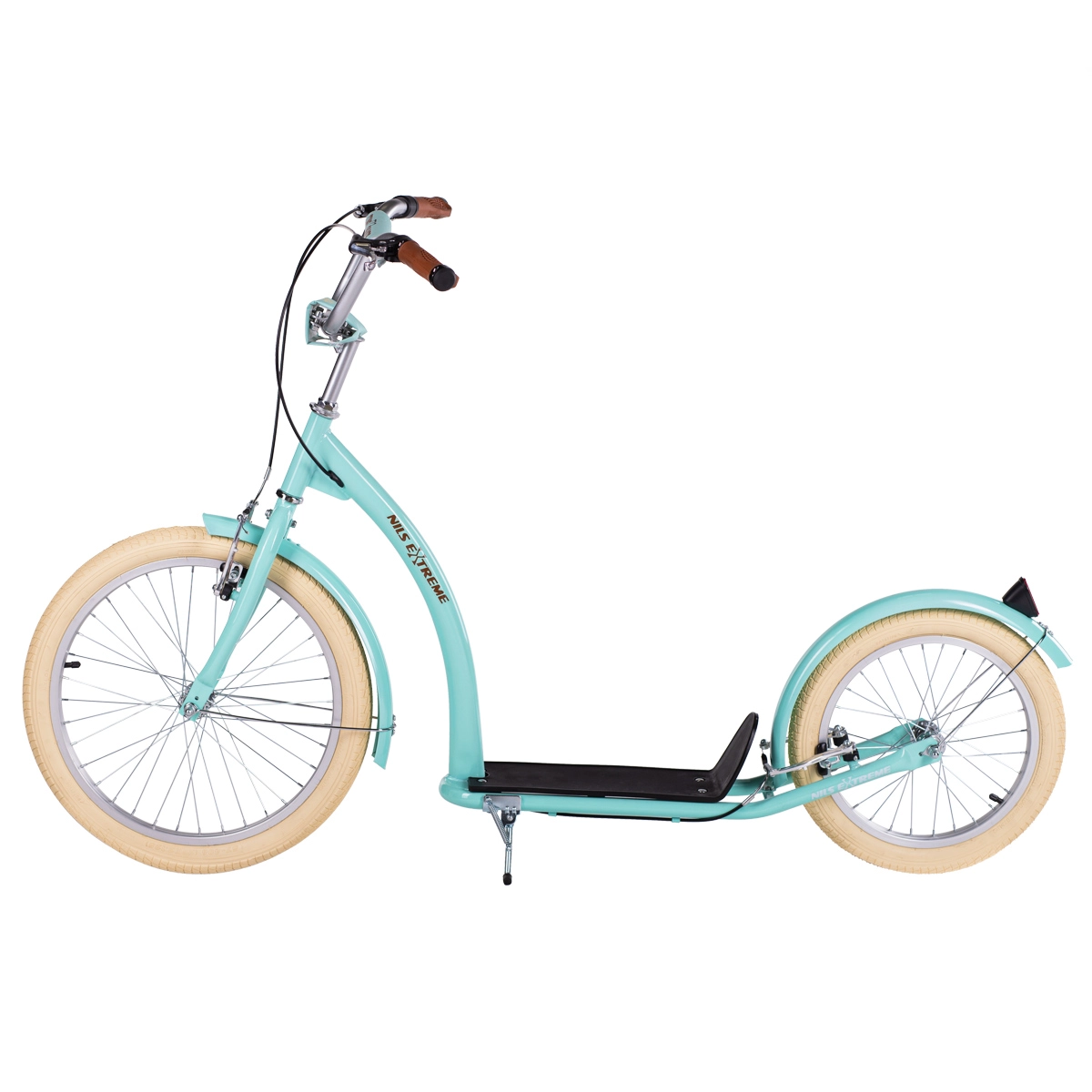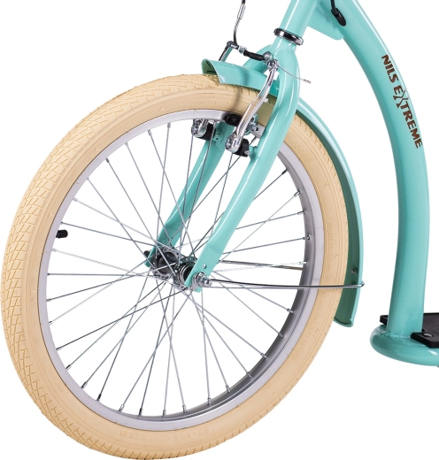 Hulajnoga NILS Extreme WH222 w kolorze miętowym została zaprojektowana do wygodnych i bezpiecznych przemieszczeń po mieście i poza nim. Duże opony pneumatyczne na aluminiowych obręczach wygładzają nierówności, a stalowa rama zapewnia sztywność i długą żywotność. Przednie koło 20" i tylne 16" zwiększają stabilność, dzielność w terenie i pewność w zakrętach.