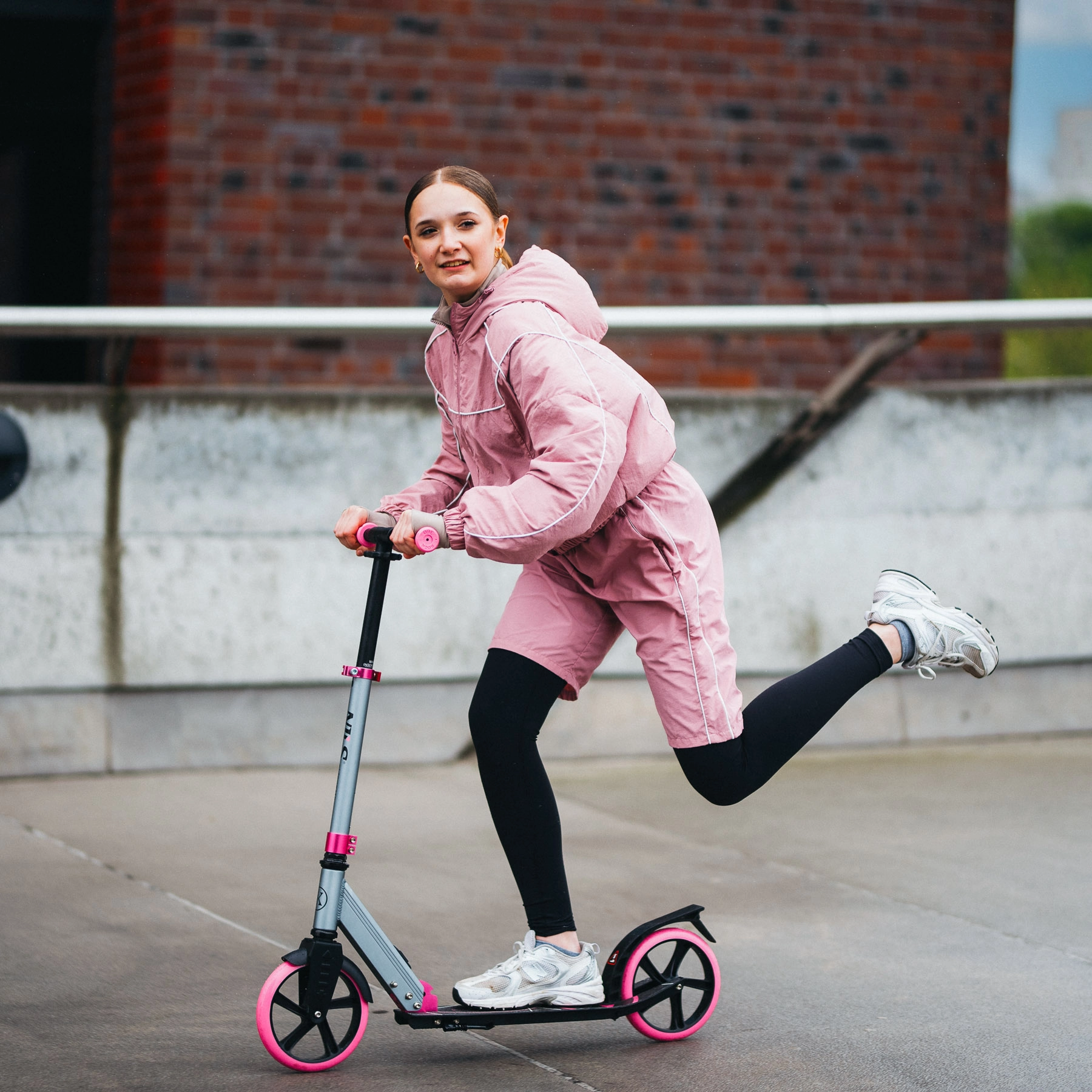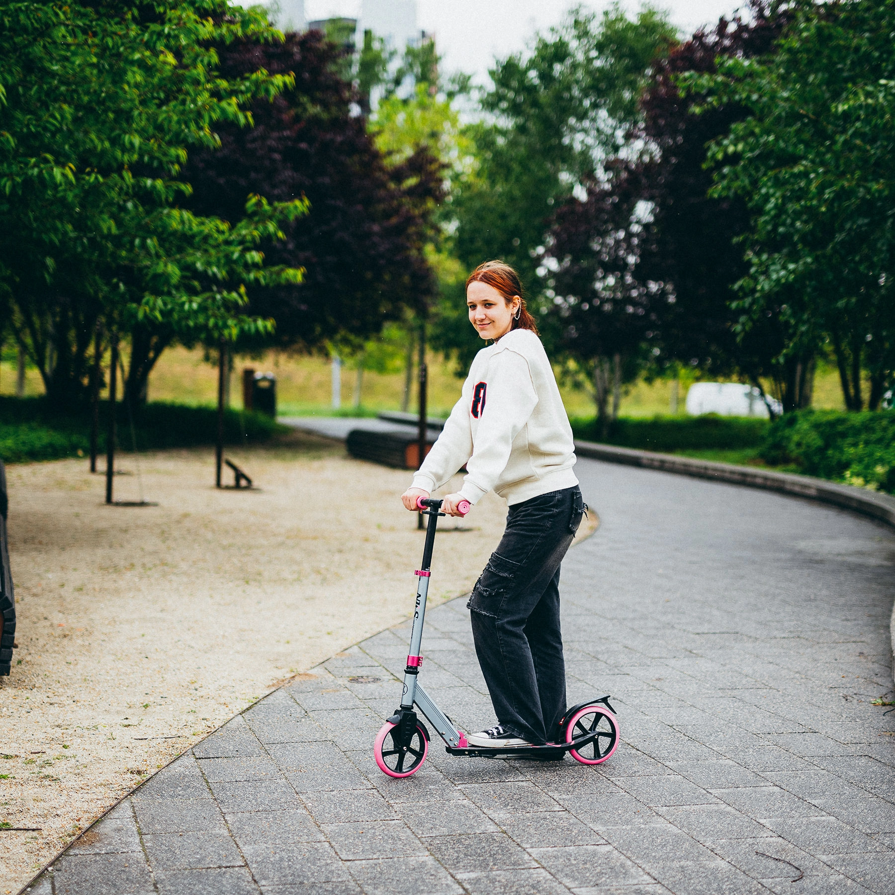 Duże kółka PU 200 mm w połączeniu z łożyskami ABEC 7 zapewniają płynną i cichą jazdę na asfalcie i utwardzonych chodnikach. Ergonomiczne gripy TPR, regulowana wysokość kierownicy (79–93 cm) oraz nisko osadzony podest poprawiają stabilność i komfort, a tylny hamulec nożny gwarantuje niezawodne hamowanie.