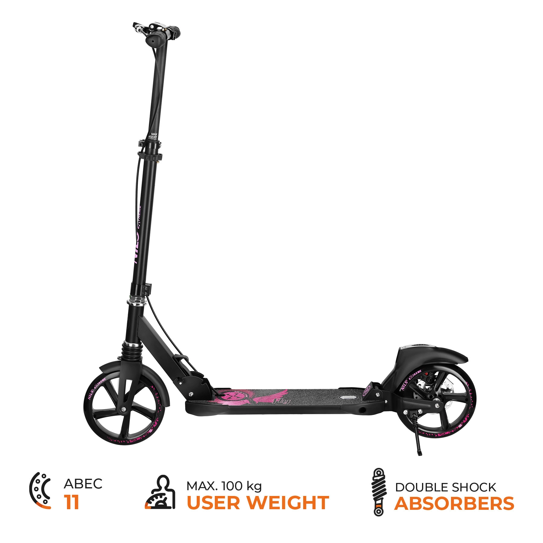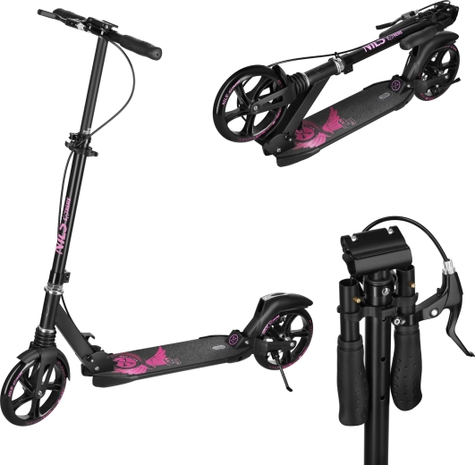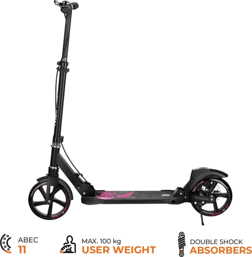 Odkryj lekką i stabilną jazdę z hulajnogą NILS EXTREME Fly. Dzięki dużym kołom 200 mm, łożyskom ABEC‑11 i amortyzatorom z przodu i z tyłu cieszysz się gładkim przejazdem po asfalcie, chodnikach i kostce. Wytrzymałe połączenie stali i aluminium zapewnia długą żywotność, a składana konstrukcja i podpórka ułatwiają codzienne użytkowanie.
