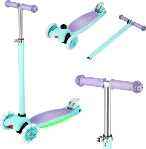 Zintegrowane diody LED w przednich kołach oraz na platformie zwiększają bezpieczeństwo o zmierzchu i nadają hulajnodze atrakcyjny wygląd. Platforma zasilana 3× AAA (LR03).