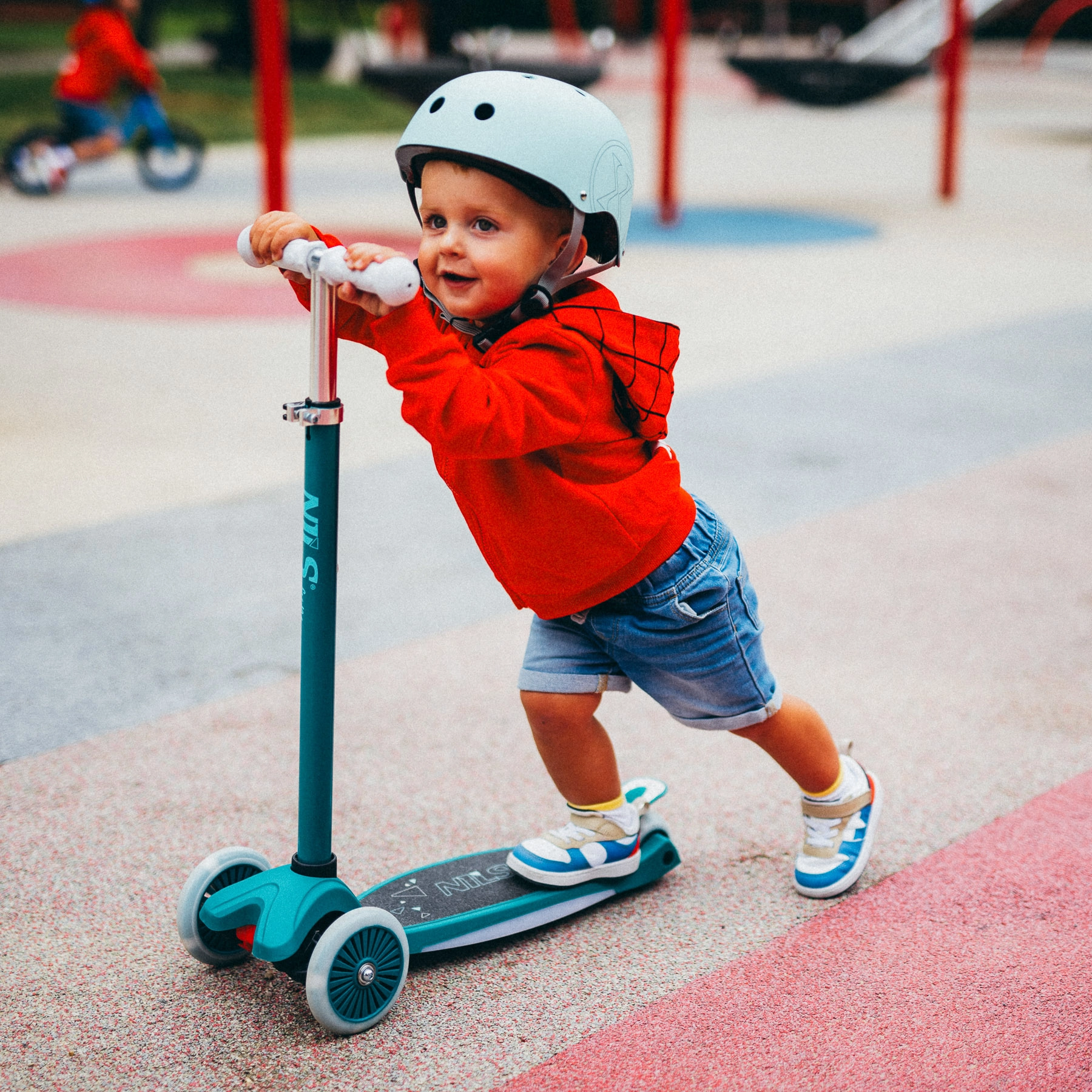 Dwa przednie koła i pochylane sterowanie pomagają dzieciom bezpiecznie skręcać bez przekręcania kierownicy. Szeroki podest i tylny hamulec zwiększają kontrolę podczas jazdy.