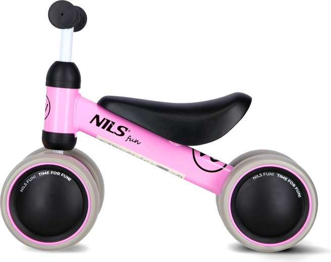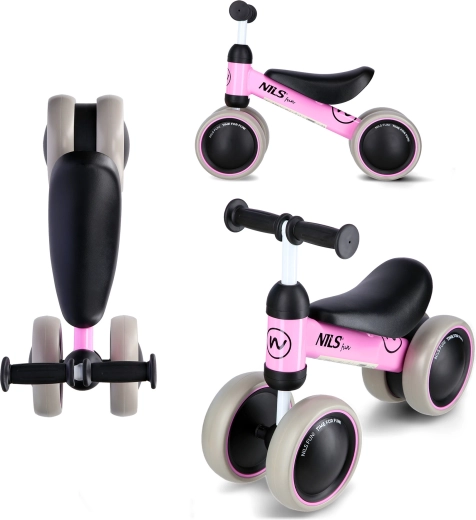 Pierwszy krok do samodzielnej jazdy: dziecięcy jeździk NILS Fun RB002 z czterema szerokimi kołami z EVA dla dodatkowej stabilności i delikatności dla podłóg. Bez pedałów, aby naturalnie rozwijać równowagę i koordynację, z wygodnymi uchwytami TPR oraz lekką ramą do łatwego manewrowania także w pomieszczeniach.