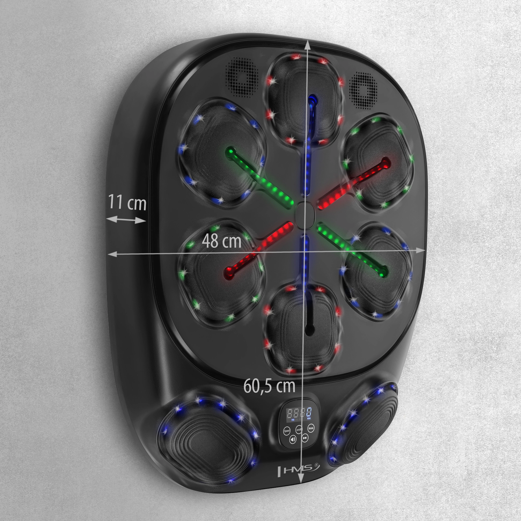 HMS TB10 to nowoczesna elektroniczna tarcza bokserska do efektywnego treningu szybkości, precyzji i wytrzymałości. Większa powierzchnia 61 × 48 cm oraz dwie dodatkowe strefy na łokcie i kolana poszerzają możliwości techniczne, a kolorowe, dynamiczne LED wyznaczają rytm i poprawiają reakcje. Bluetooth ze wbudowanym głośnikiem odtworzy Twoją ulubioną muzykę i utrzyma Cię w tempie.