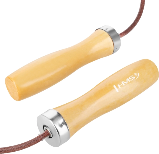 Skakanka HMS to niezawodne narzędzie do cardio, spalania kalorii i poprawy koordynacji. Skórzana linka (270 cm) jest wytrzymała i zapewnia stabilny zamach, a łożyska kulkowe w rękojeściach gwarantują płynną i szybką rotację bez zacinania. Ergonomiczne drewniane rękojeści dobrze leżą w dłoni i zmniejszają zmęczenie podczas dłuższego ćwiczenia.