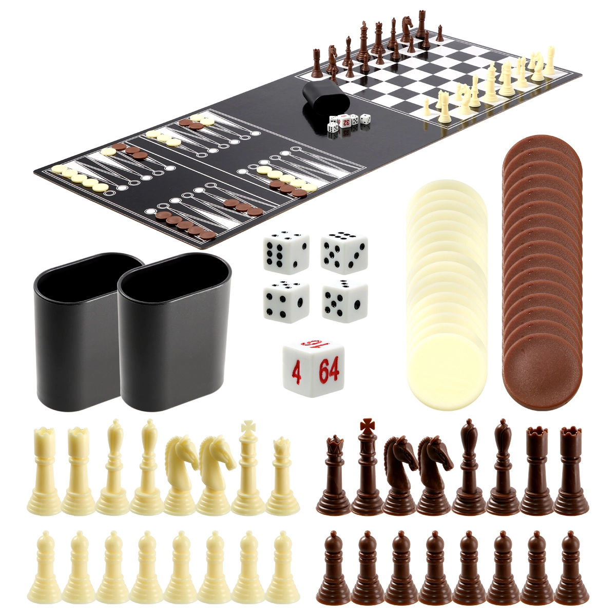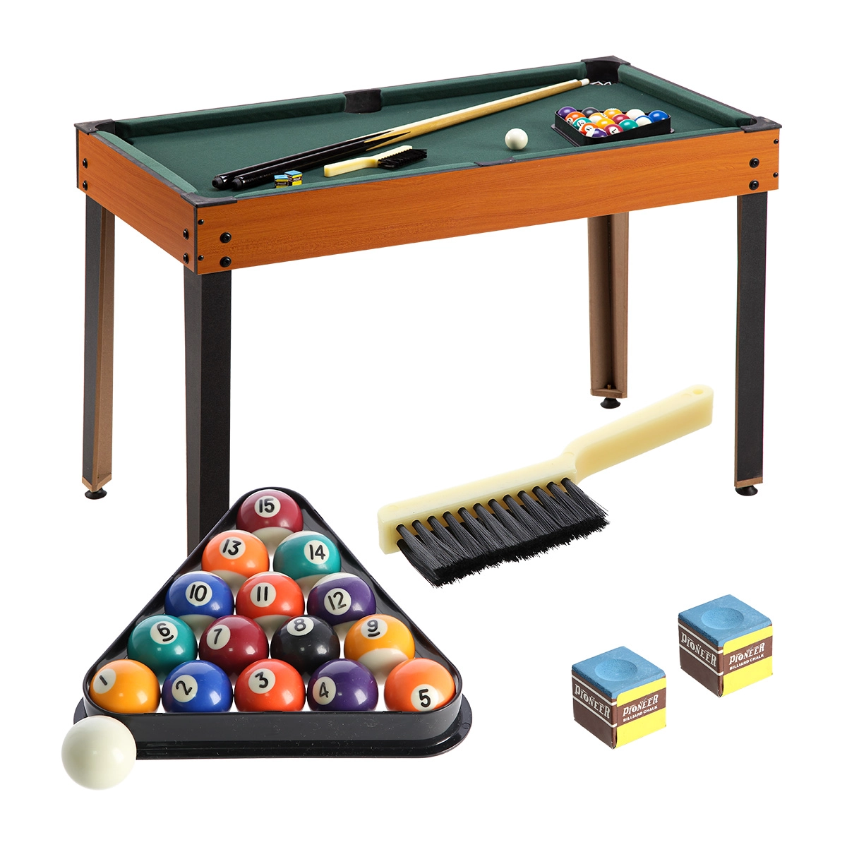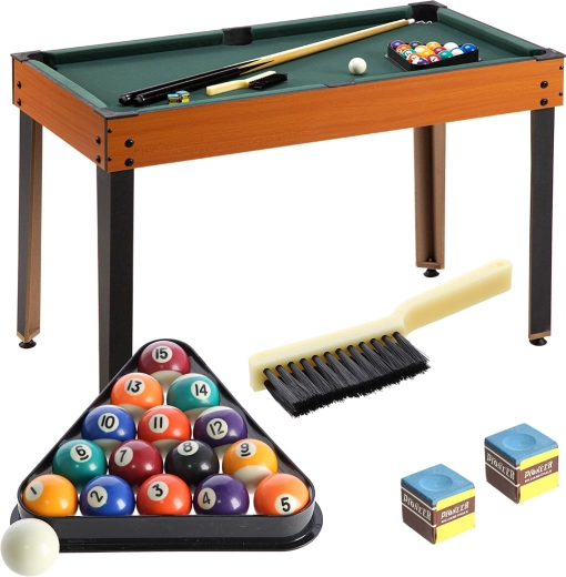 - 2 odbijaki i 2 krążki; 2 piłeczki do piłkarzyków; kij, zestaw kul, trójkąt, 2 kredy, szczoteczka; siatka, 2 rakietki i piłeczka do tenisa stołowego; figury szachowe, kamienie do warcabów/tryktraka, 2 kubki, 4+1 kości; 10 kręgli, kula, 6 kamieni do shuffleboardu; 2 talie kart
