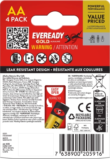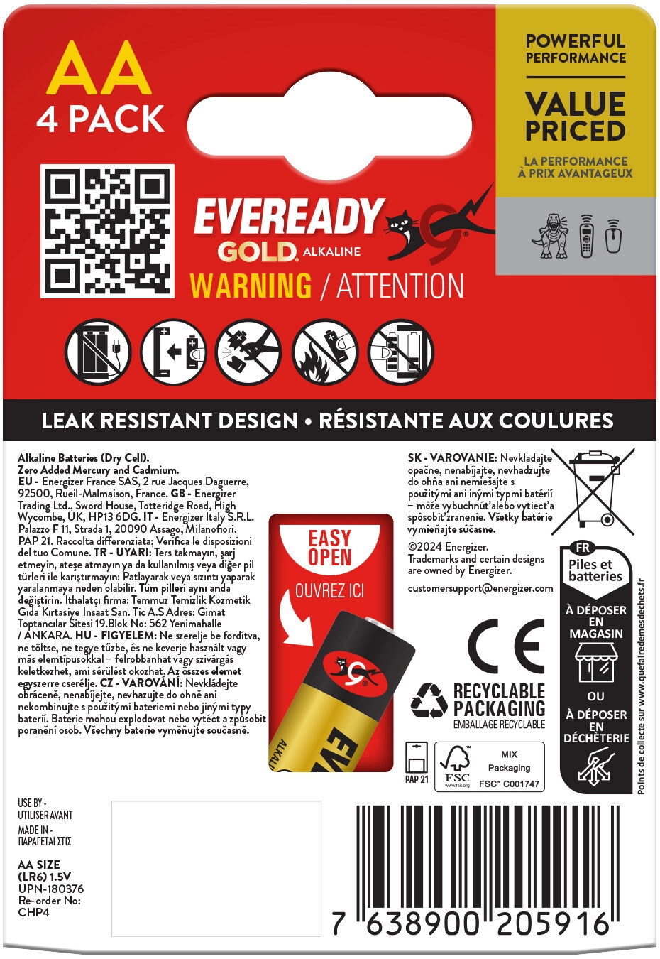 Szukasz uniwersalnego zasilania do domowej elektroniki? ENERGIZER Eveready Gold w rozmiarze AA to baterie alkaliczne zaprojektowane do niezawodnej pracy urządzeń o normalnym do średniego poborze energii. Zapewniają długotrwałą energię i niższe samorozładowanie w porównaniu z alternatywami cynkowo‑węglowymi.