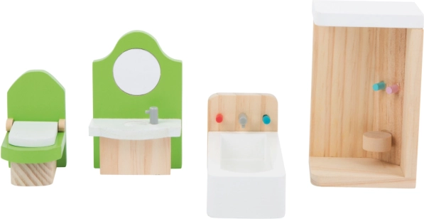 Stylowy zestaw łazienkowych mebli do domku dla lalek ucieszy wszystkich małych konstruktorów. Zawiera kabinę prysznicową, wannę, umywalkę z lustrem oraz WC w przyjemnym połączeniu zieleni i naturalnego drewna. Wykonany z litego drewna dla długiej żywotności i bezpiecznej zabawy. Wspiera wyobraźnię i motorykę małą, odpowiedni dla zginanych lalek do 12 cm.
