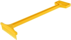 Długi trzonek i profilowane zakończenie zapewniają stabilne trzymanie podczas grabienia piasku i liści.