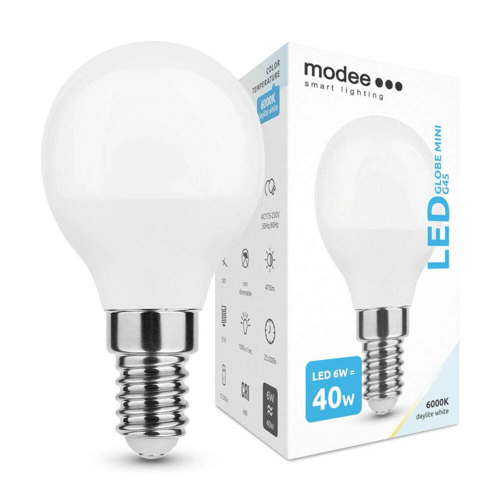 Modee LED Globe Mini G45 łączy oszczędną pracę z wysokiej jakości oświetleniem. Barwa światła zimna biel 6000K sprawdza się w kącikach do pracy, kuchniach i korytarzach, gdzie liczy się jasność i koncentracja. Dzięki kompaktowym wymiarom G45 pasuje do mniejszych opraw i dekoracyjnych lamp.
