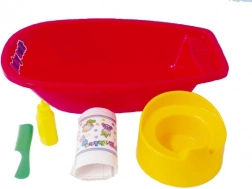 Dostępny w dwóch wersjach kolorystycznych, dzięki czemu dzieci mogą wybrać według własnych preferencji. Wymiary plastikowej wanienki to 40 x 9,5 cm, idealne dla lalek o różnych rozmiarach. To świetny prezent dla każdej małej dziewczynki, która lubi bawić się w mamę.
