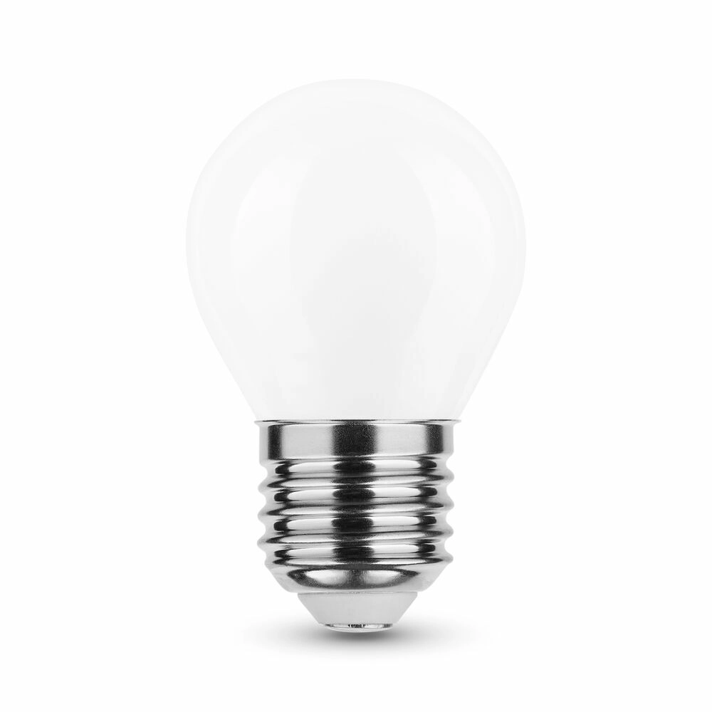 Mini żarówka LED w kompaktowej formie G45 łączy nowoczesną technologię Filament z eleganckim mlecznym szkłem. W porównaniu z klasycznymi rozwiązaniami SMD rozmieszcza diody LED na przezroczystych włóknach, co zapewnia wyższą efektywność, stabilny strumień świetlny oraz przyjemnie rozproszone światło bez olśnienia.